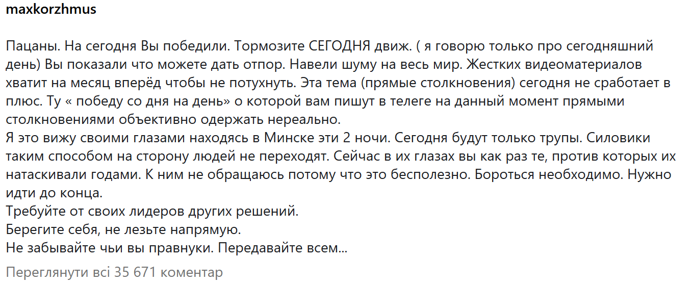 Критики згадують і події 2020 року в Білорусі. Після оголошення перемоги Олександра Лукашенка на президентських виборах і початку масових протестів, які жорстоко придушували силовики, Макс Корж не підтримав учасників акцій. Навпаки, він закликав того дня зупинити активні дії, пояснюючи це тим, що протестувальники вже привернули увагу світу, а подальші сутички не принесуть того результату, якого вони прагнуть.