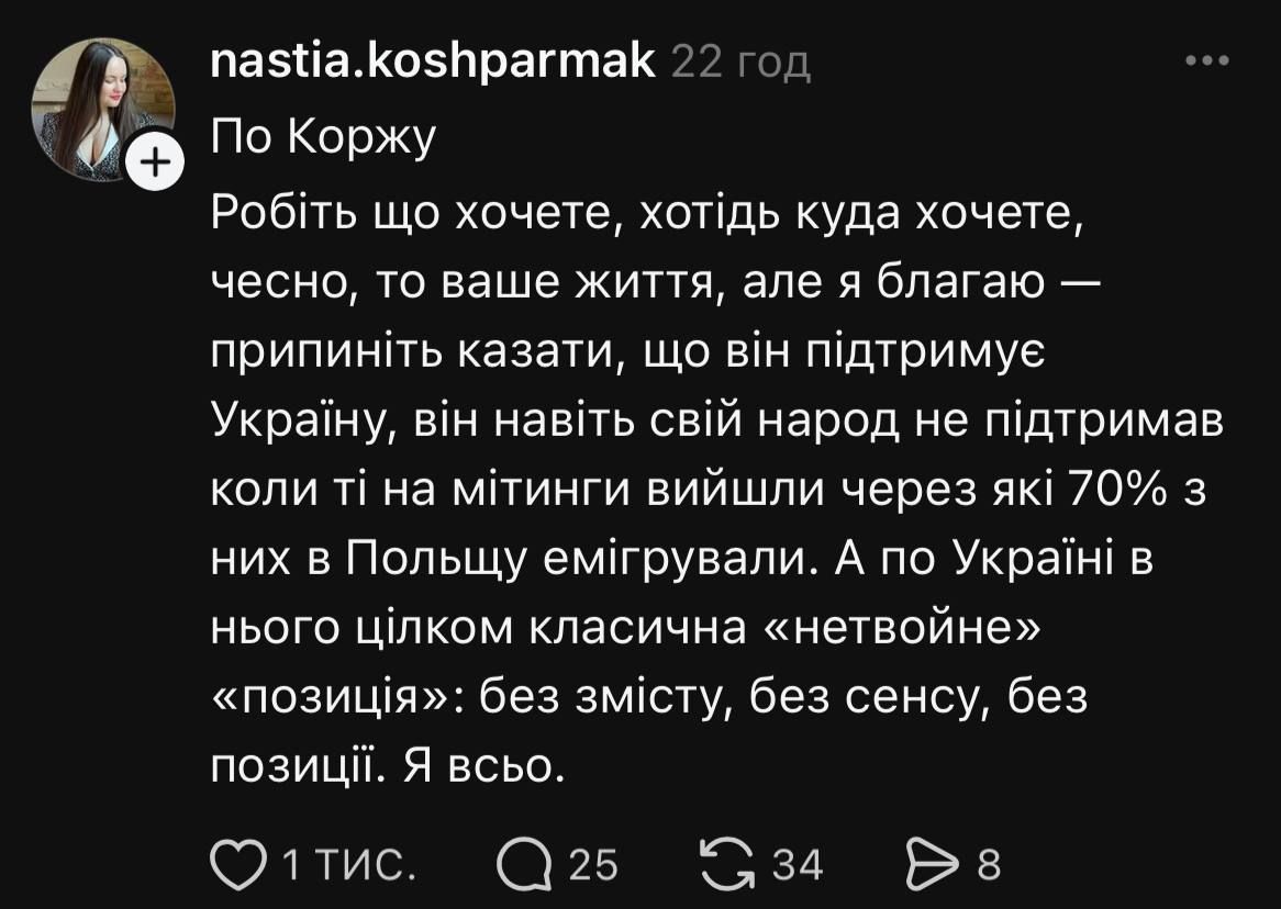 Через це частина слухачів вважає, що висловлювання Макса Коржа сьогодні – це класична "нетвойна" позиція: без чіткого змісту та підтримки України.