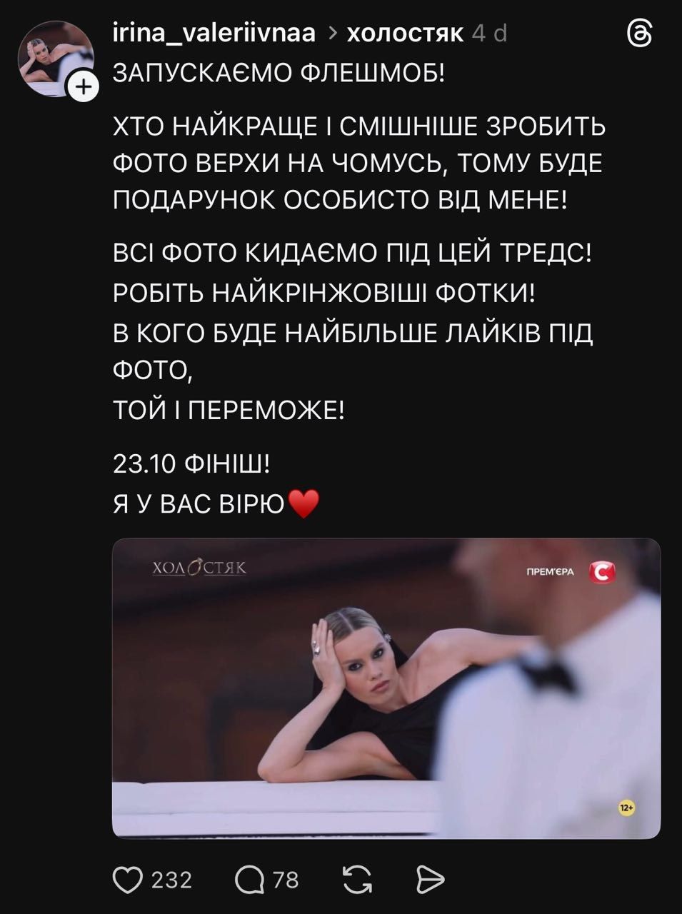 Сама Ірина, яка стала причиною такого "вибуху" у соцмережах, також безпосередньо долучилась до серії мемів. Учасниця проєкту навіть організувала конкурс на найсмішнішу картинку. Переможцю вона пообіцяла подарунок.