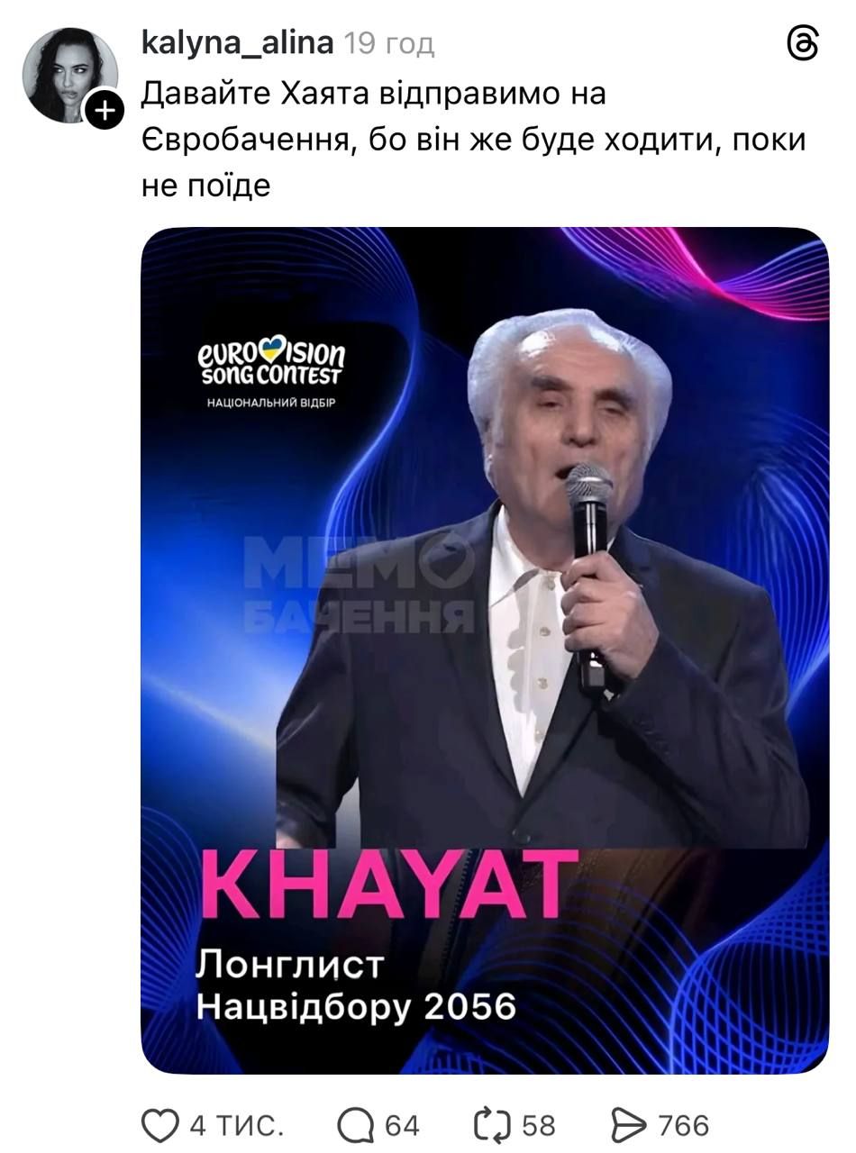 Так, наприклад, один з мемів, який зібрав багато позитивних реакцій, стосувався участі співака KHAYAT в Нацвідборі-2026.