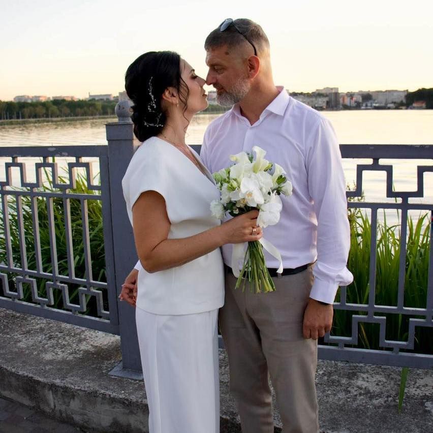 Михайло Діанов показав фото з обручками, а також продемонстрував романтичну світлину наречених. Він позував у білій сорочці й сірих штанах, а його обраниця Мирослава – у білосніжній спідниці міді та жакеті без рукавів.