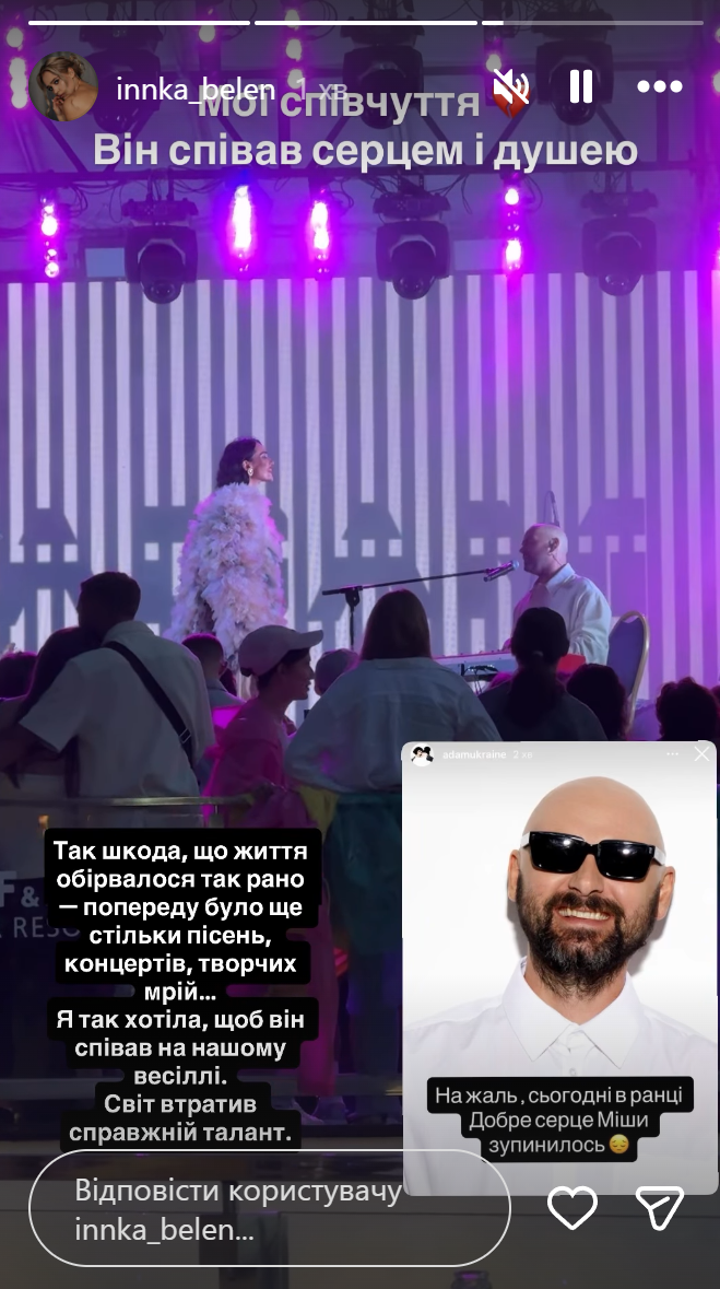 нна Бєлєнь відреагувала на смерть Михайла Клименка з гурту ADAM / Скриншот з інстаграм-сторіс
