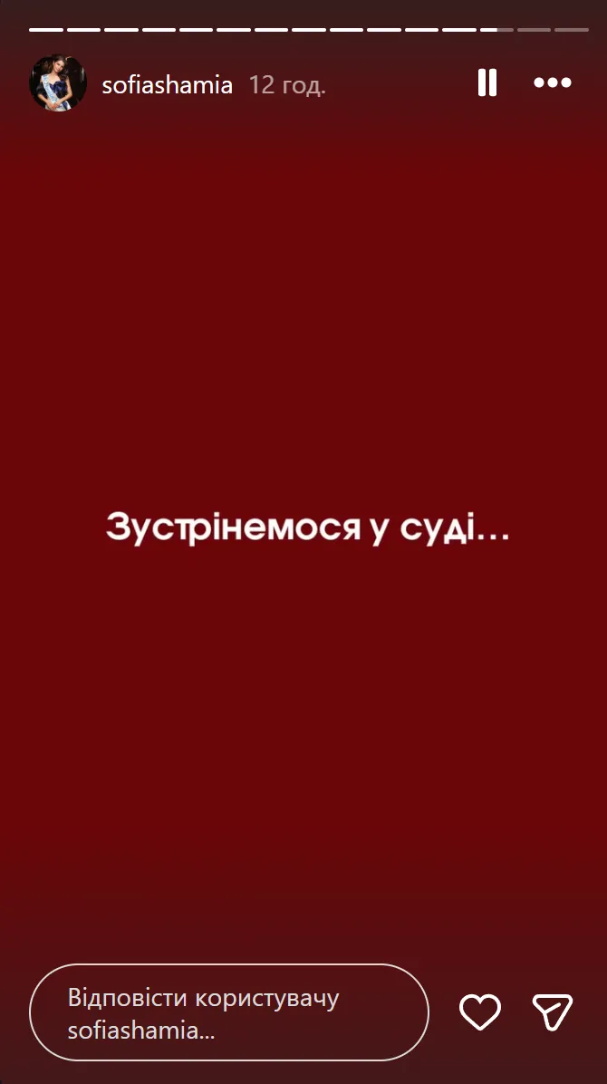 Водночас, коли випуск вийшов в ефір, Софія виставила інстаграм-сторіс: "Зустрінемось в суді".