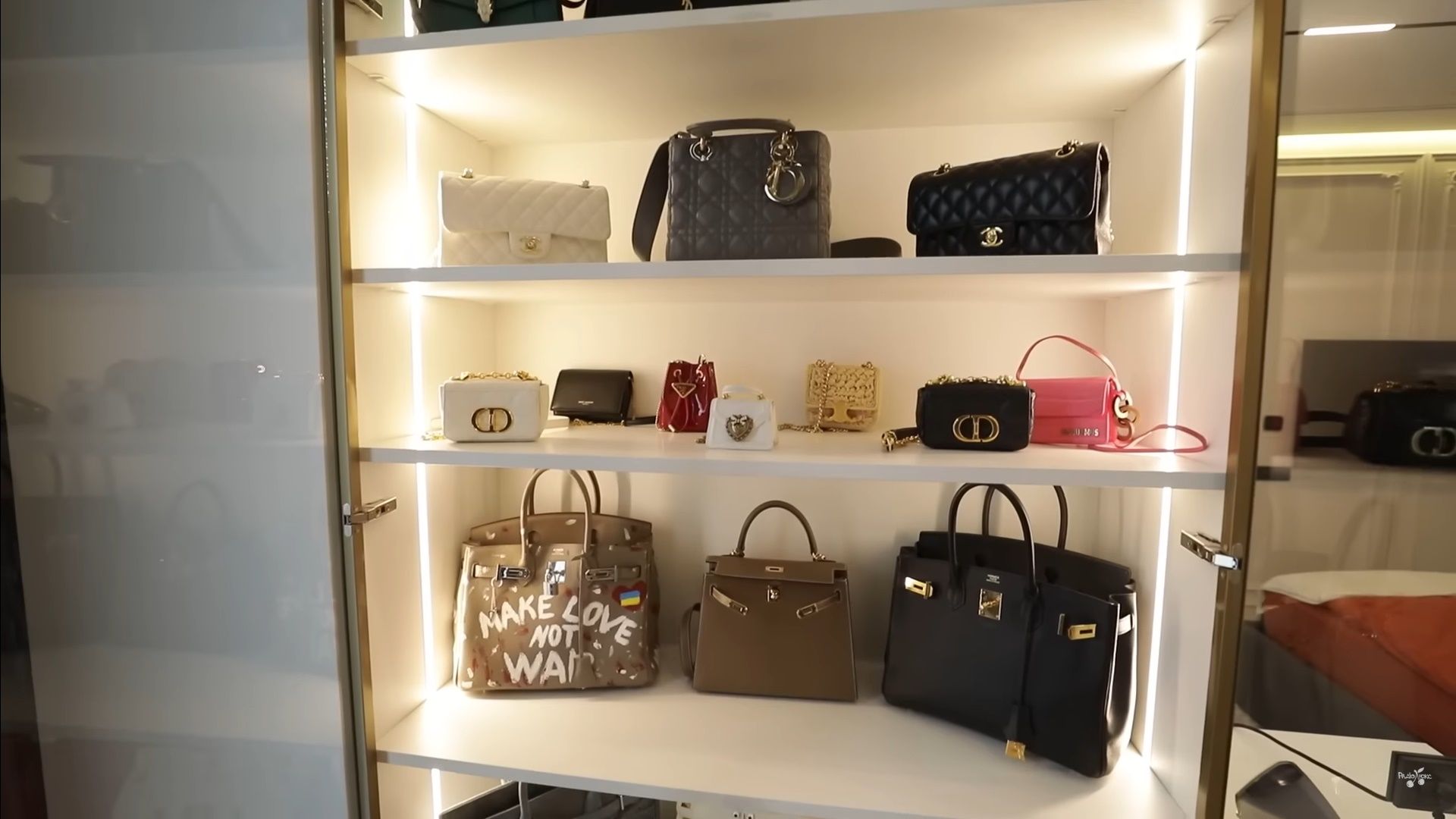 У спальні в "Міс України Всесвіт" є прозора шафа з колекцією дизайнерських сумок, яку вона жартома називає "інвестиційною полицею" – Dior, Prada, Chanel Bulgari, Hermès.