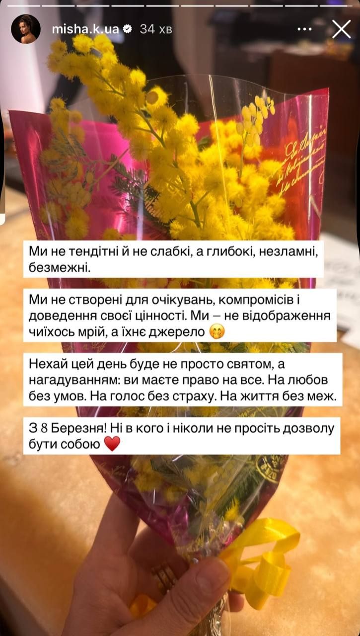 "Нехай ніщо і ніхто не стоїть на шляху вашої реалізації, ваших мрій та великих звершень. Нехай з вами станеться все, що ви вкладаєте в слово щастя. Жіноцтво пройшло довгий шлях, аби ми мали ті можливості, які маємо. І хоч зрозуміло, що справедливості у світі не існує, ми все одно можемо виточувати свою реальність, своє право жити власне життя по-своєму", – написала Саніна.