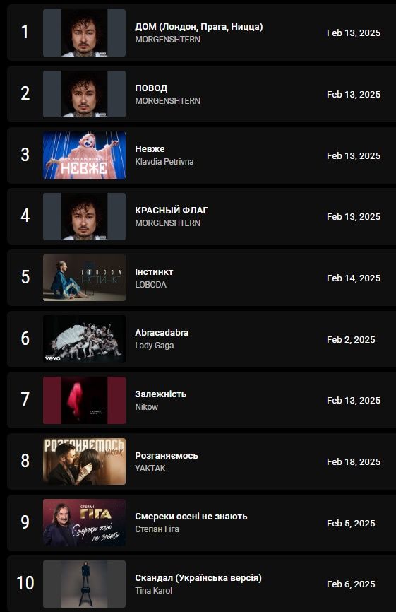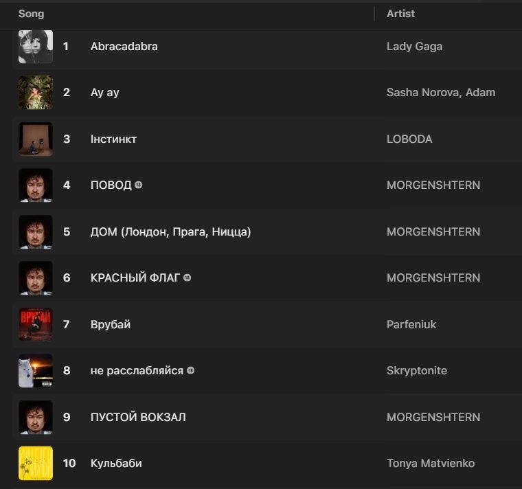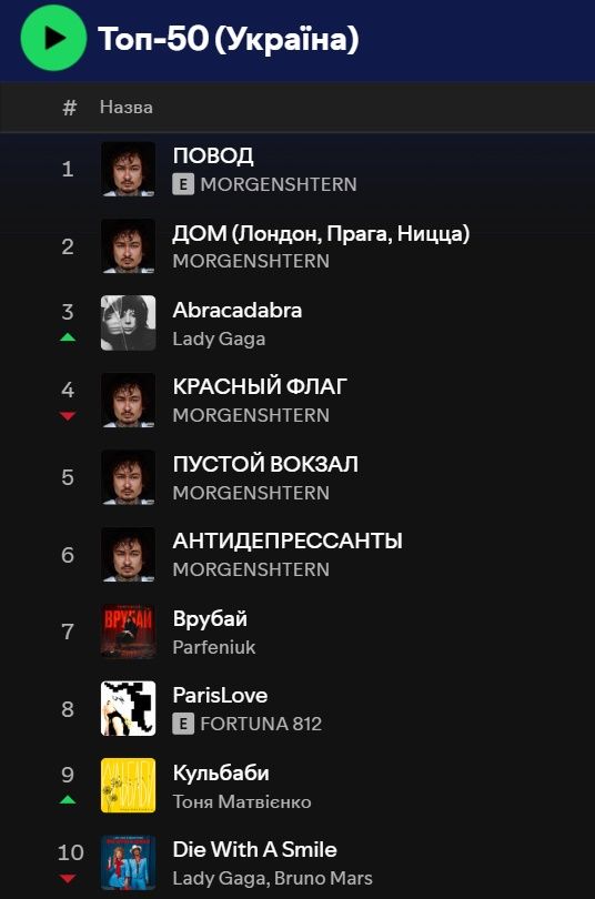 Моргенштерн подекуди витіснив останні українські хіти – "Кульбаби", "Врубай", "Ау ау", а також треки закордонних артистів, зокрема Леді Гаги.