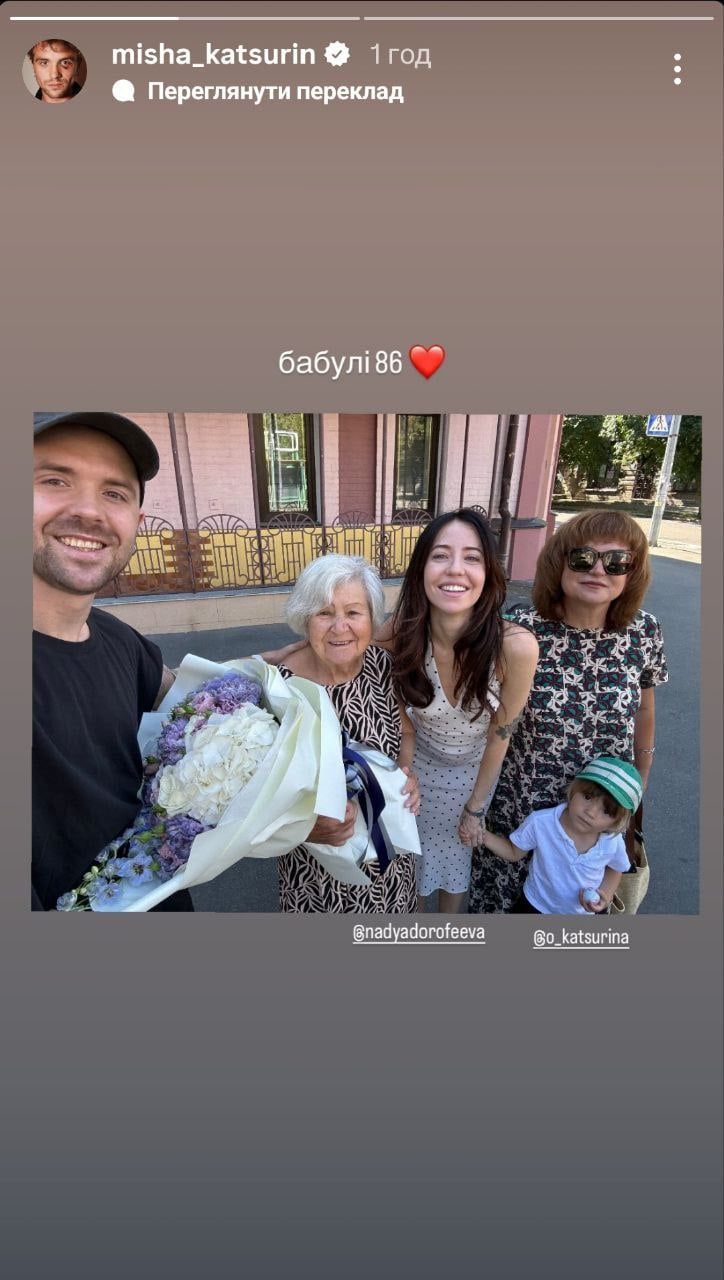 Відомо, що бабусі Михайла Кацуріна цьогоріч виповнилося 86 років. Її день народження вони відсвяткували у колі найрідніших, завітавши до італійського ресторану. Ресторатор показав фото, на одному з яких позував він з бабусею, дружиною, мамою та сином від попереднього шлюбу.