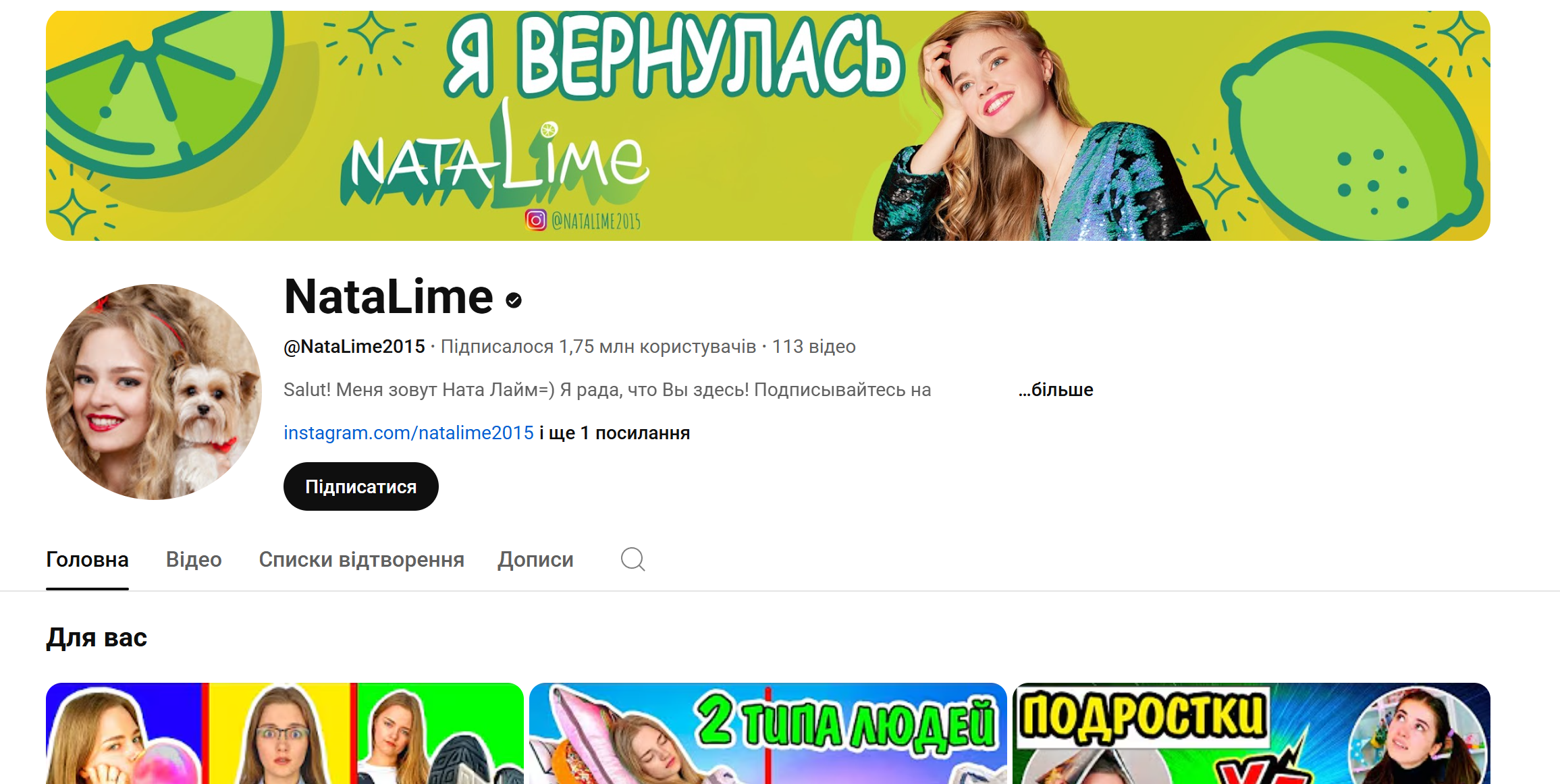 Ютуб-канал Нати Лайм / Скриншот з ютубу