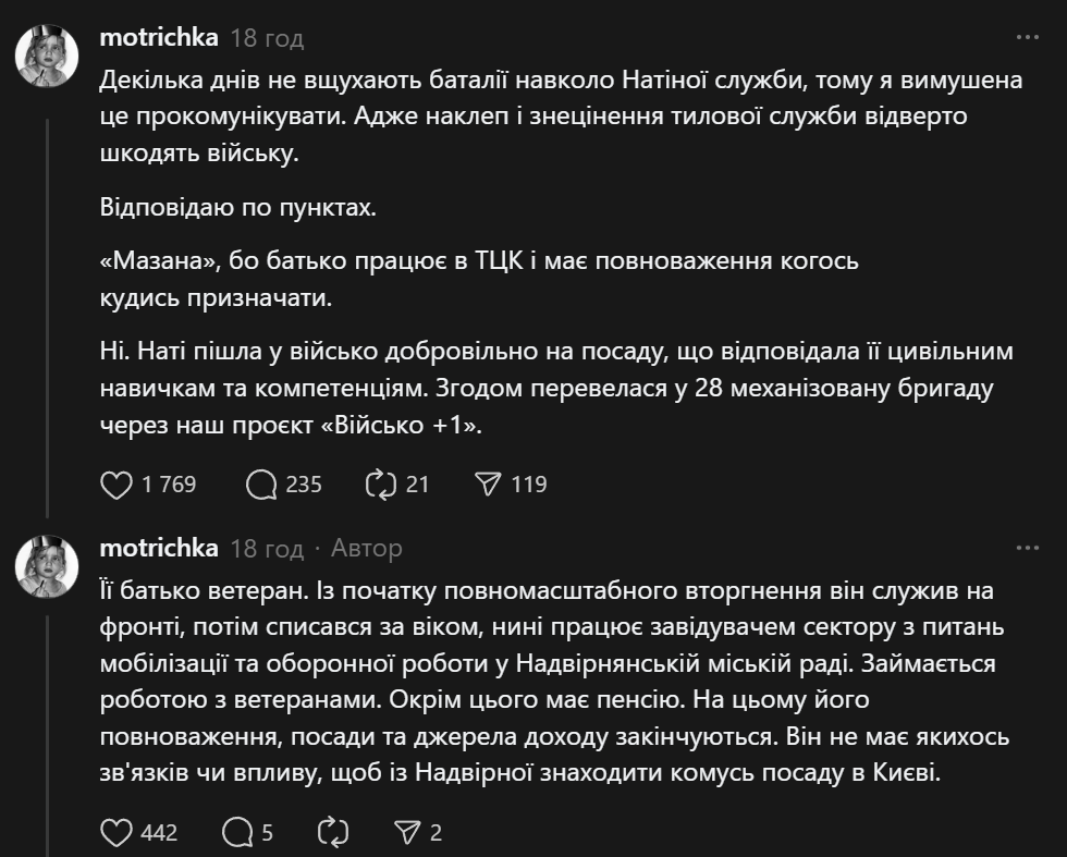 "Мазана", бо батько працює в ТЦК і має повноваження когось кудись призначати. Ні. Наті пішла у військо добровільно на посаду, що відповідала її цивільним навичкам та компетенціям. Згодом перевелася у 28 механізовану бригаду через наш проєкт "Військо +1",