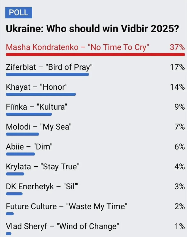 Так, в онлайн-опитуванні лідером Нацвідбору Євробачення, як вважають закордонні фанати, є Маша Кондратенко з піснею No time to cry, яка отримала 37% голосів.