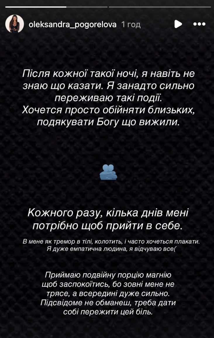 Учасниця 12 сезону "Холостяка" написала щемливі слова щодо сьогоднішньої атаки на Київ. Дівчина зазначила, що вдячна Богові за те, що вдалось вижити. Крім того, Олександра доволі тривожно переживає такі події, тому зараз вимушена приймати ліки, щоб заспокоїти внутрішню тривогу.