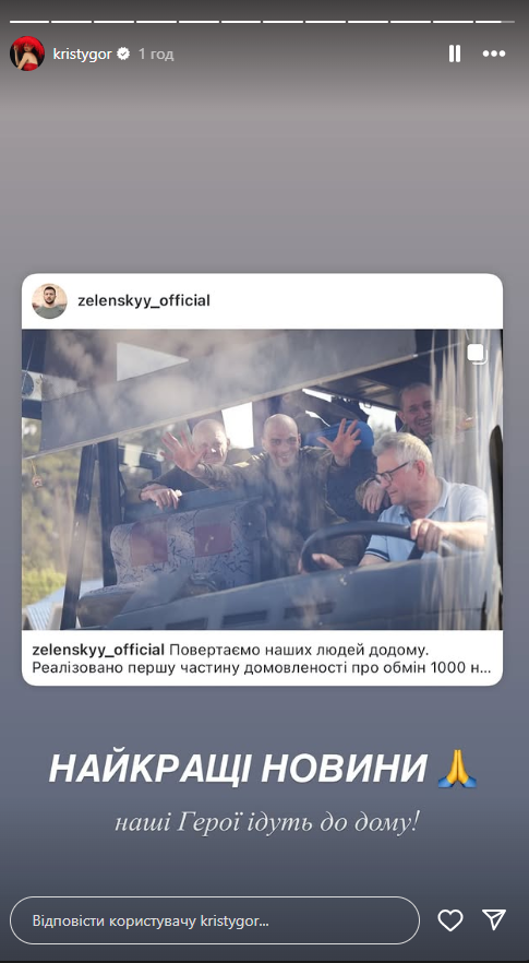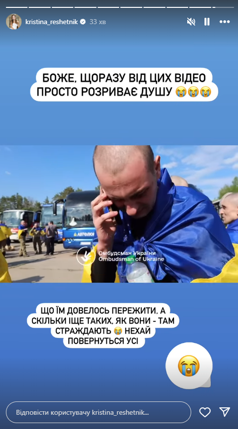 Блогерка також відреагувала на повернення українських полонених. В інстаграм-сторіс вона опублікувала відео, де звільнені військові плачуть, говорячи телефоном з близькими.