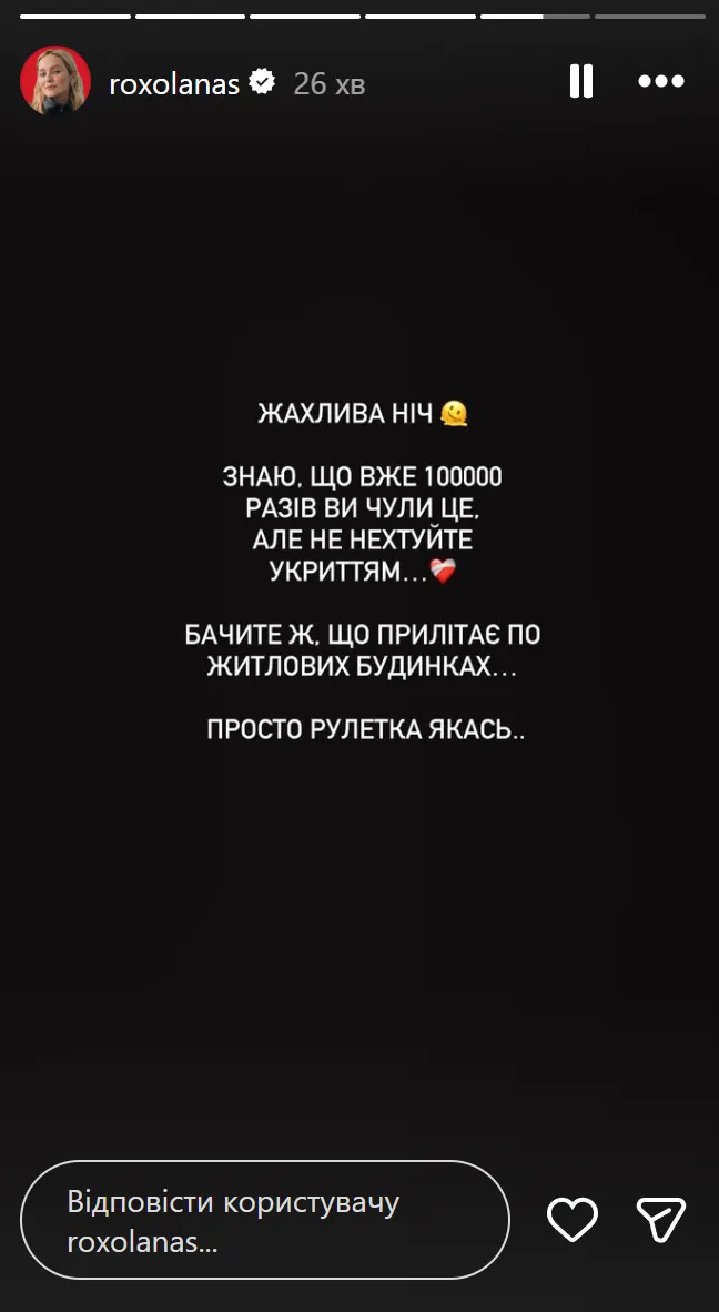 ROXOLANA прокоментувала ракетний обстріл столиці / Скриншот з інстаграм-сторіс