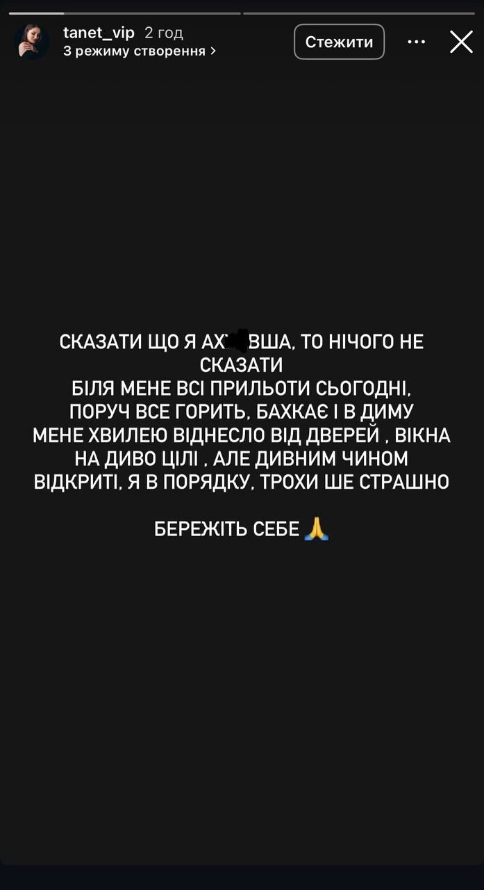 Сказати, що я аху*вша – то нічого не сказати. Біля мене всі "прильоти" сьогодні. Поруч усе горить, бахкає і в диму. Мене хвилею віднесло від дверей. Вікна, на диво, цілі. Але дивним чином відкриті. Я в порядку, трохи ще страшно. Бережіть себе,