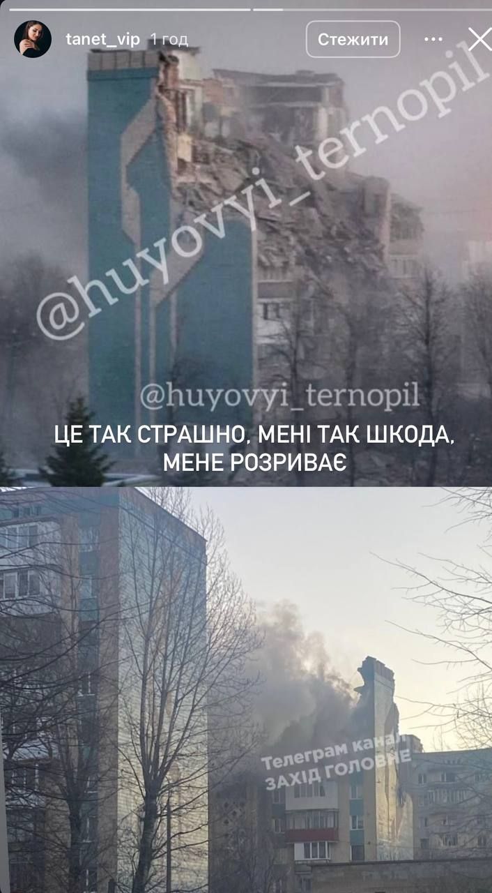 Акторка також поділилась фотографією зруйнованої багатоповерхівки, яку поширив один із місцевих телеграм-каналі.