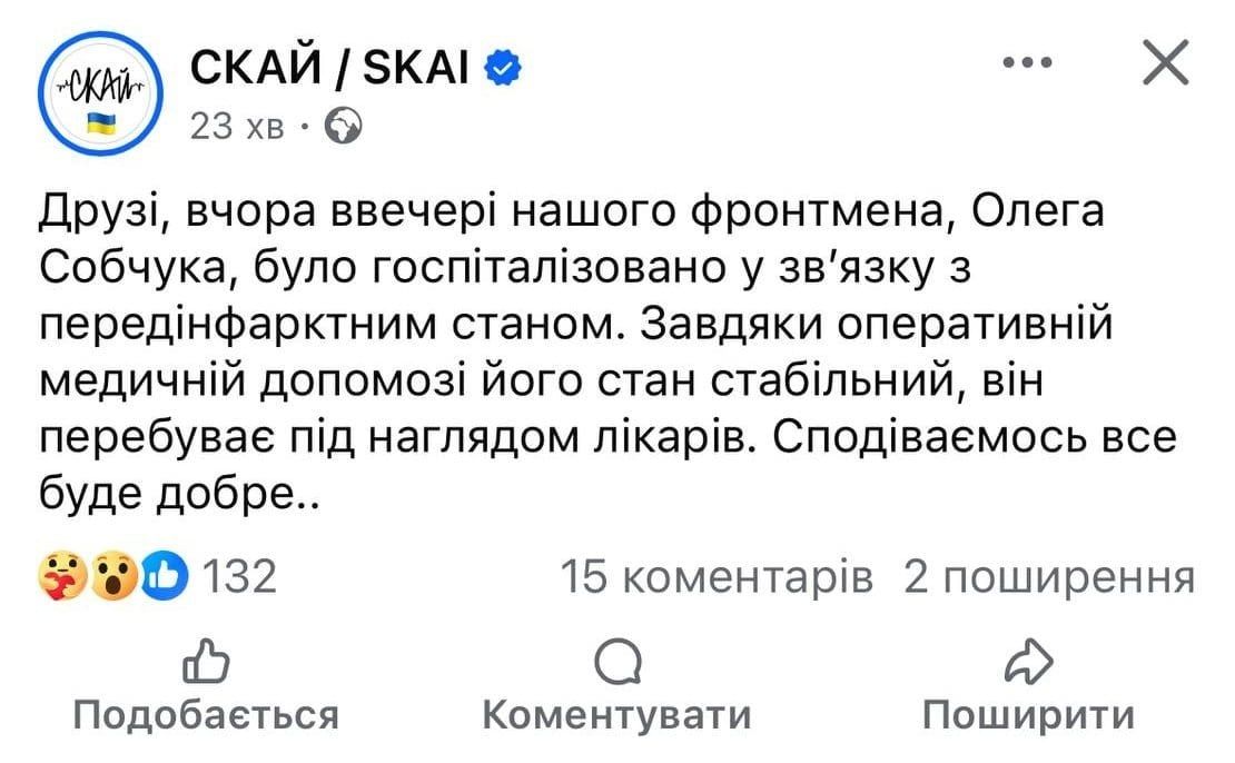 Втім, наразі цієї публікації на фейсбук-сторінці гурту немає, і нової інформації про стан артиста команда СКАЙ поки що не оприлюднила.