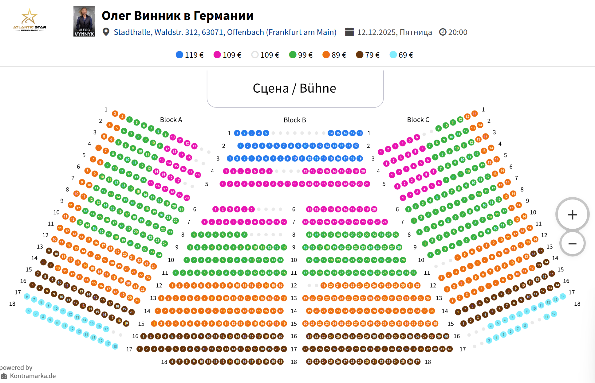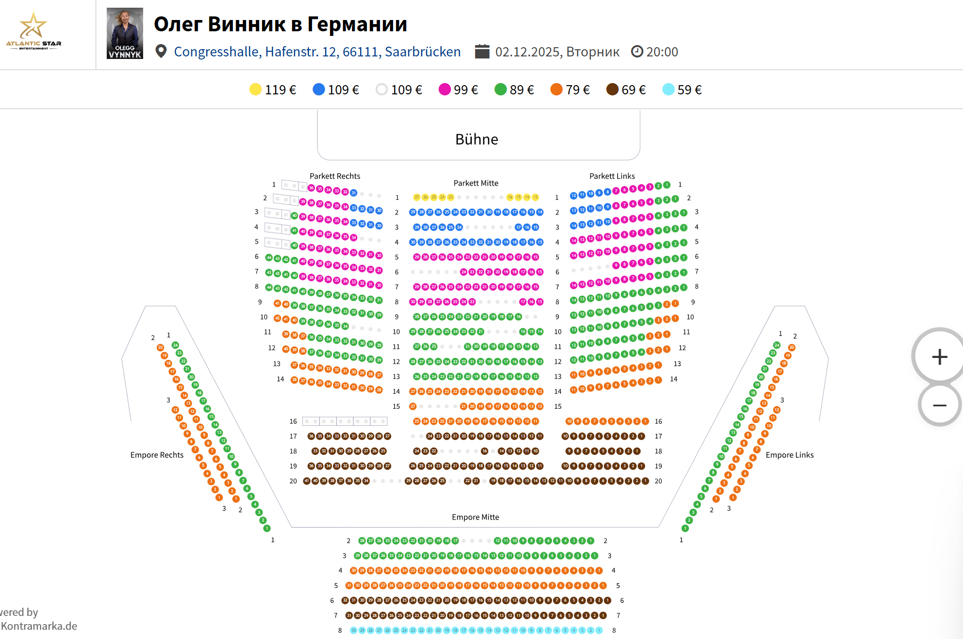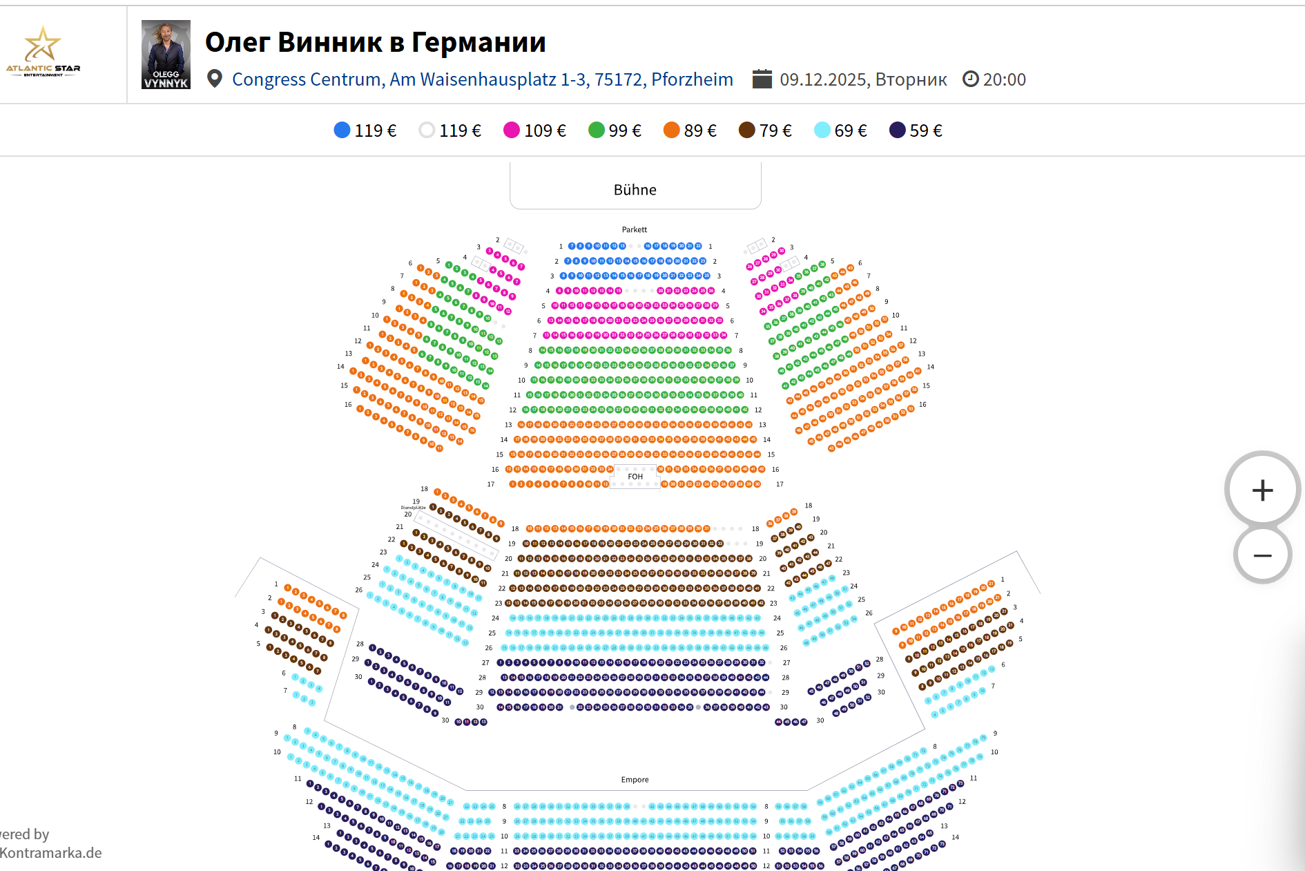 Організатори обрали престижні зали: від Congresshalle у Зарбрюккені до Friedrich-Ebert-Halle у Гамбурзі. Ціни на квитки стартують від 59 євро (приблизно 2800 грн), а місця у VIP-секторах обійдуться майже у 119 євро (близько 5700 грн). Та попри масштаб і престиж локацій, більшість місць досі вільні – це підтверджують схеми залів на платформах продажу.