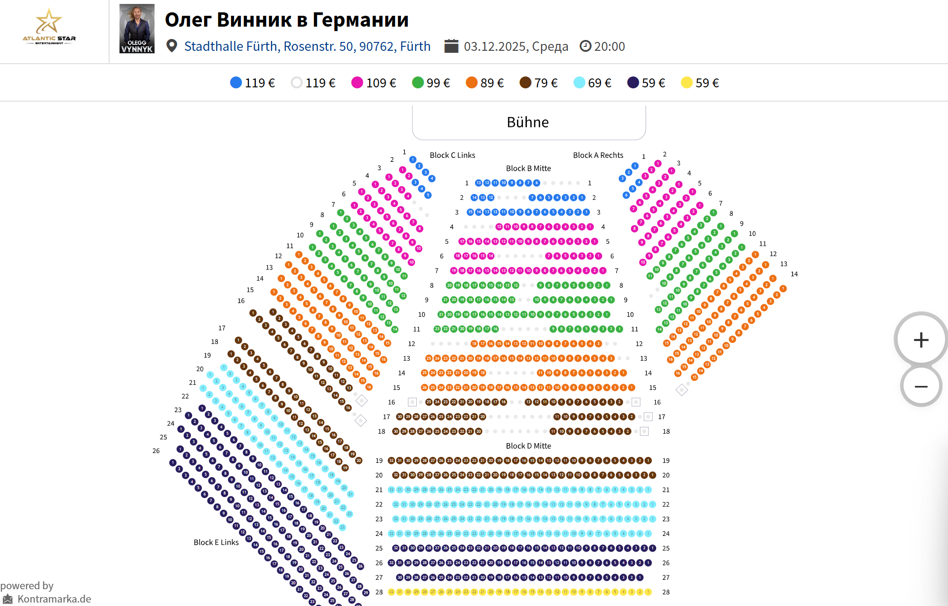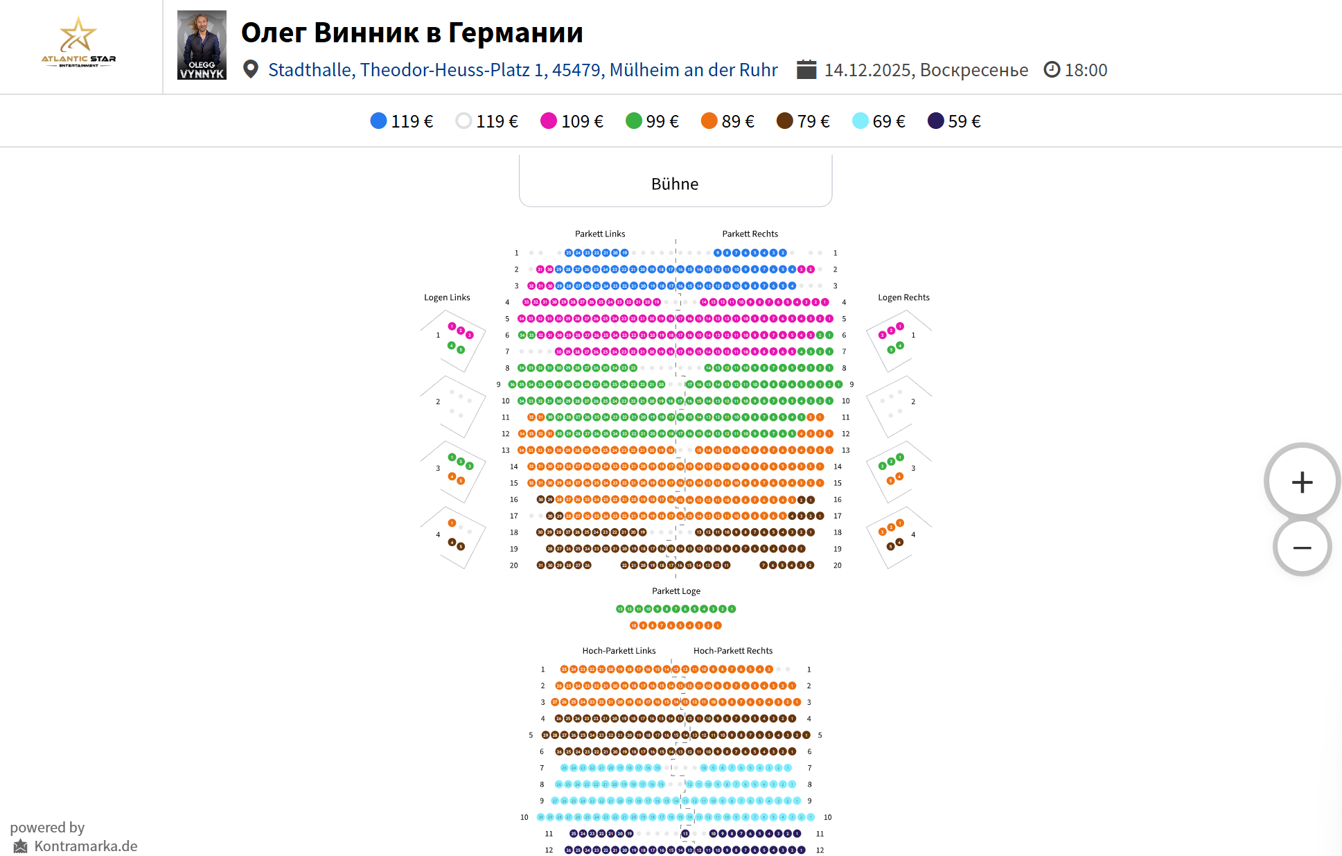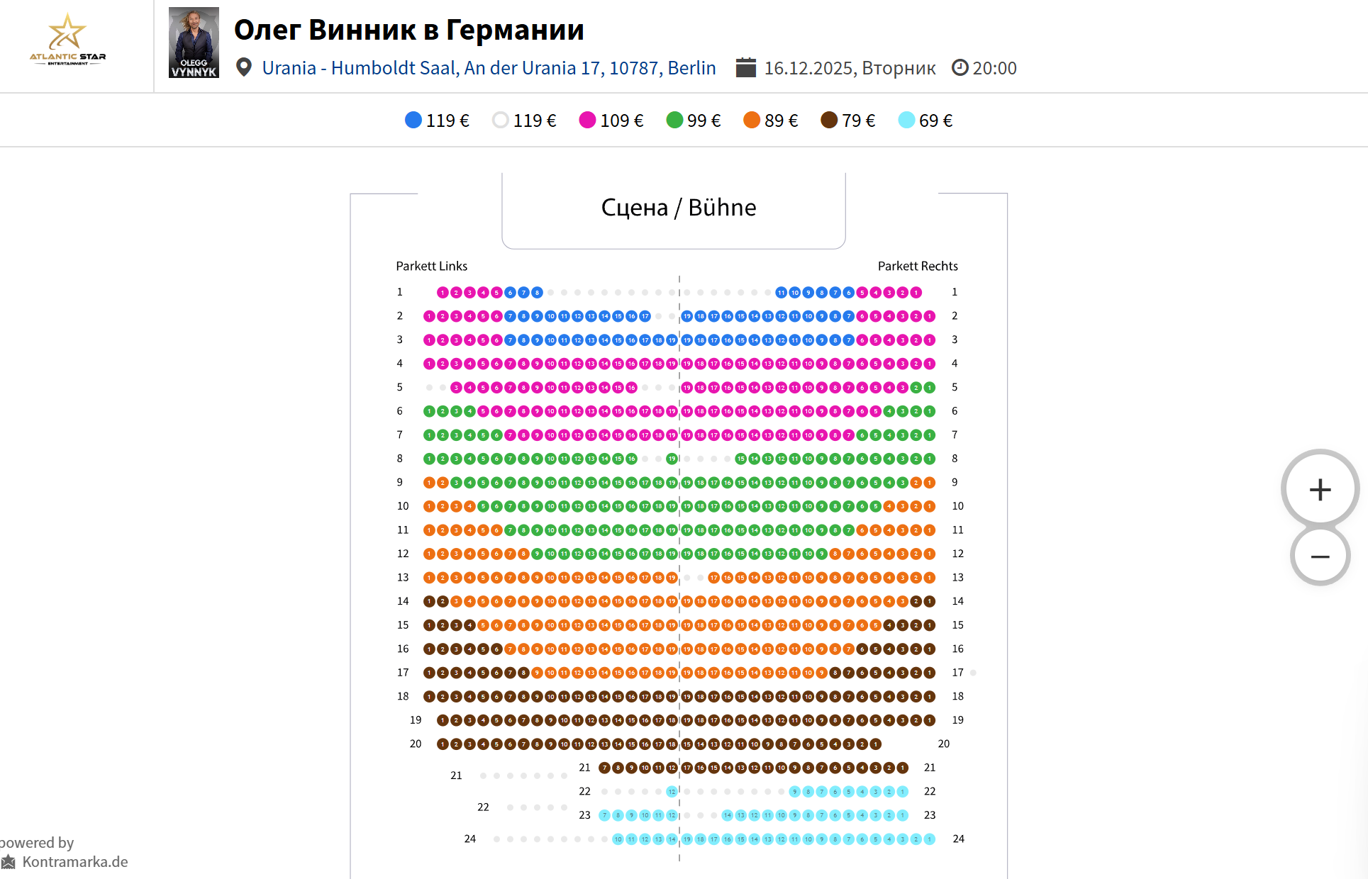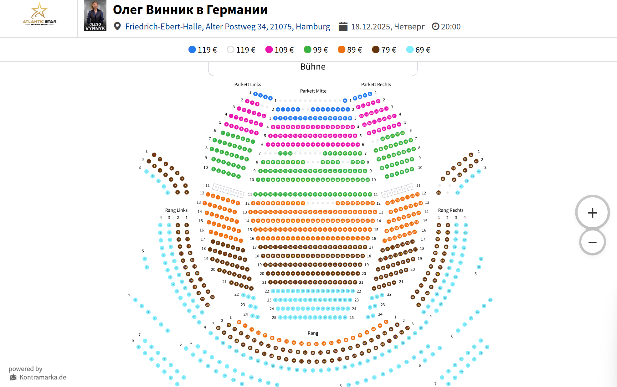 Організатори обрали престижні зали: від Congresshalle у Зарбрюккені до Friedrich-Ebert-Halle у Гамбурзі. Ціни на квитки стартують від 59 євро (приблизно 2800 грн), а місця у VIP-секторах обійдуться майже у 119 євро (близько 5700 грн). Та попри масштаб і престиж локацій, більшість місць досі вільні – це підтверджують схеми залів на платформах продажу.