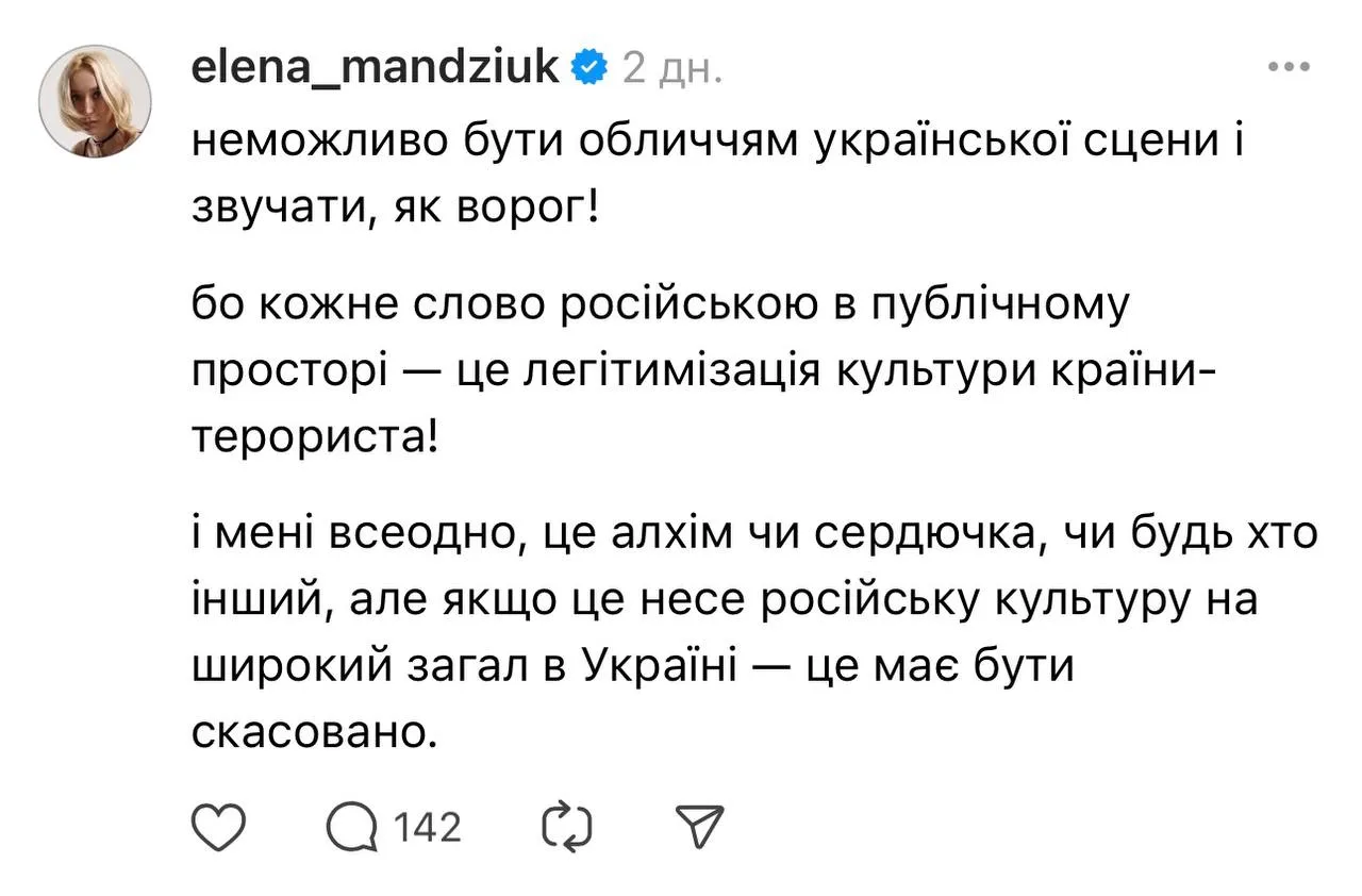 Також Олена Мандзюк опублікувала великий допис в інстаграмі, де виступала проти толерування російського в українському просторі. Блогерка нагадала, як Росія роками забороняла українську мову.