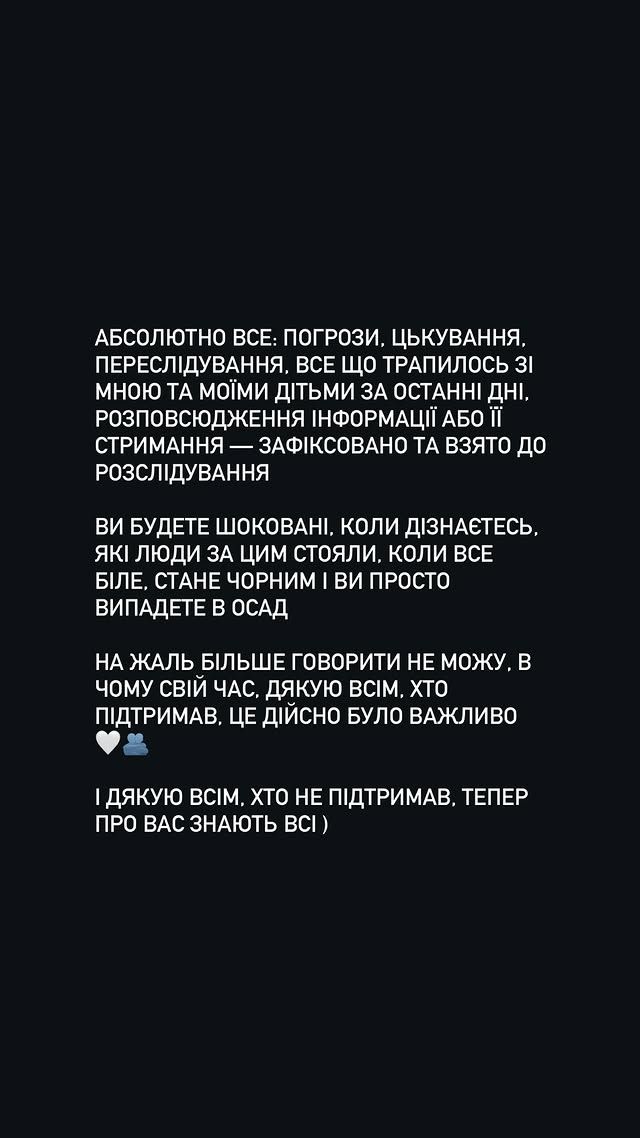 Абсолютно все: погрози, цькування, переслідування, все, що трапилось зі мною та моїми дітьми за останні дні, розповсюдження інформації або її стримання – зафіксовано та взято до розслідування. Ви будете шоковані, коли дізнаєтесь, які люди за цим стояли. Коли все біле стане чорним і ви просто випадете в осад,