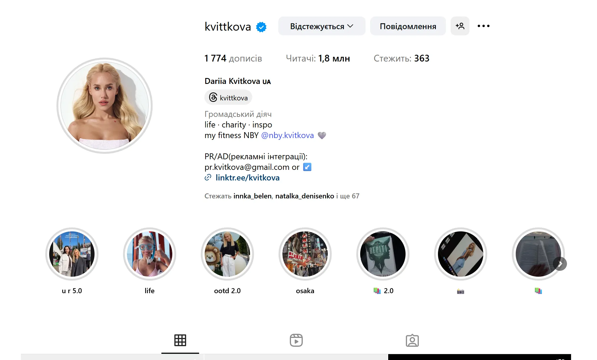 Сторінка Даші Квіткової / Скриншот з інстаграму