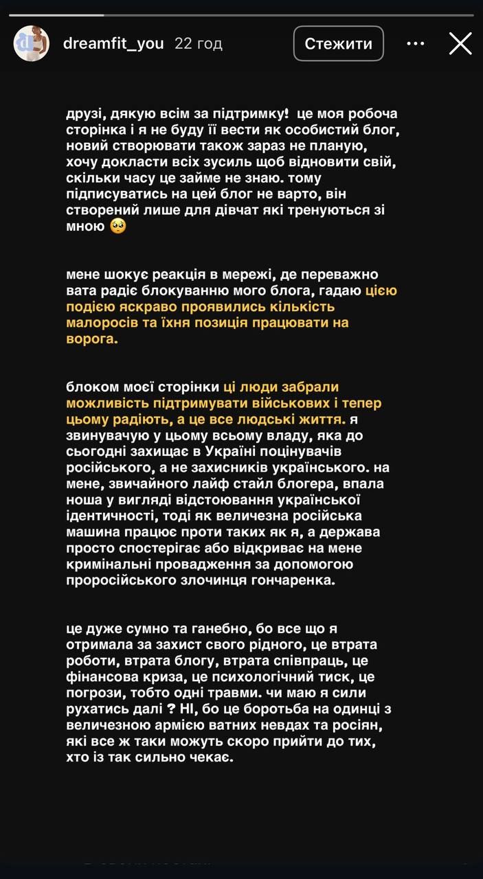 Друзі, я зрозуміла, що проти вас не піду. Ви – потужні, міцні. Ви – сила. Ви – усе понад усе. Це моє останнє повідомлення в інстаграмі. Два акаунти мені вже знесли, зараз цей також знесуть. Я нічого не можу з цим зробити. Дуже боляче і сумно. Тепер я в телеграмі. Єдиний народ!,