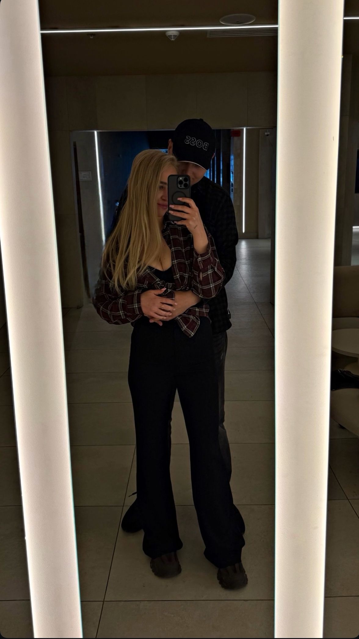 Інна постала на фото у чорних джинсах, топі з глибоким декольте та у сорочці в клітинку. А її бойфренд обрав темне повсякденне вбрання. Неможливо не помітити, що обранець Бєлєнь значно вищий за неї.