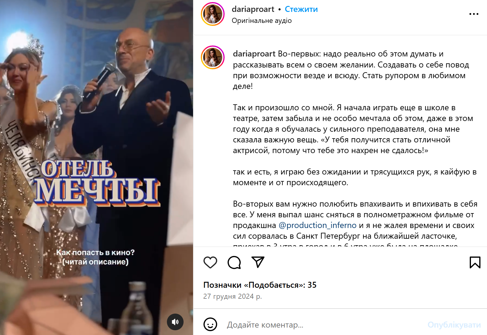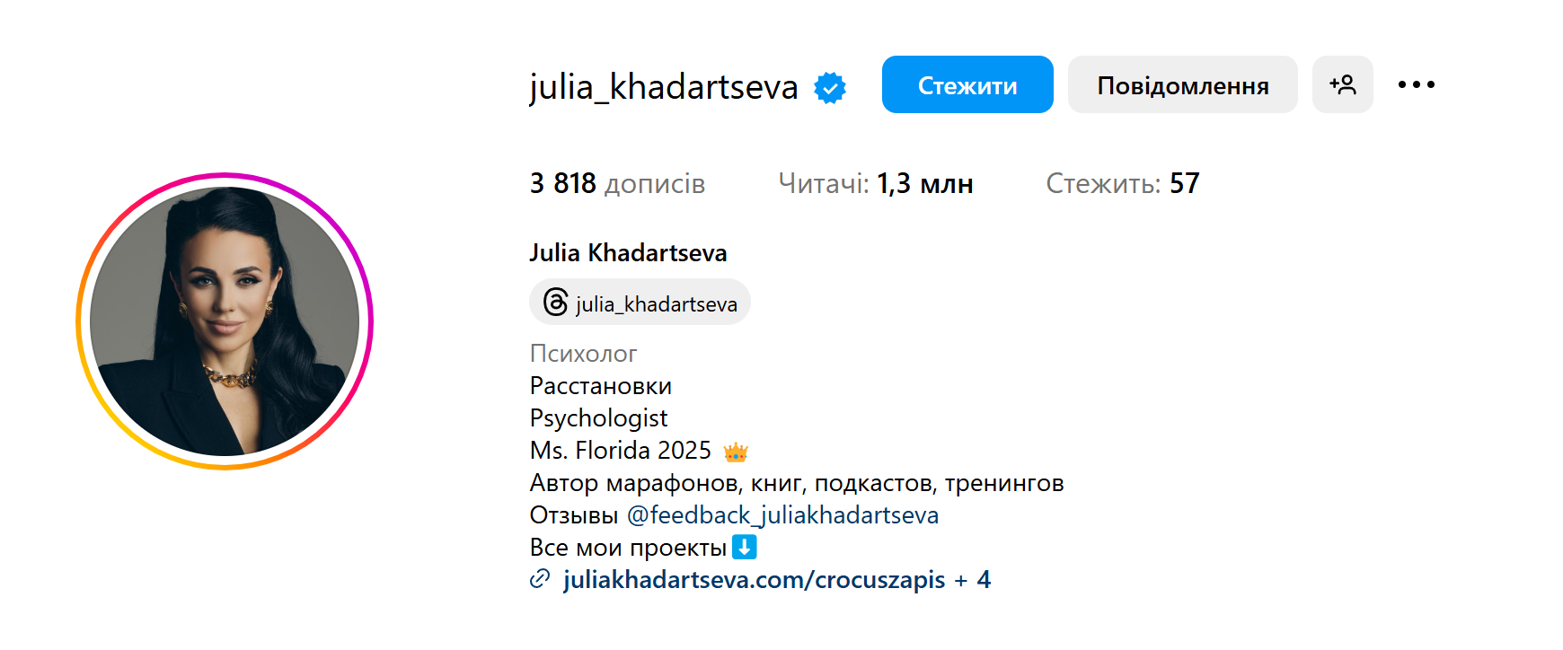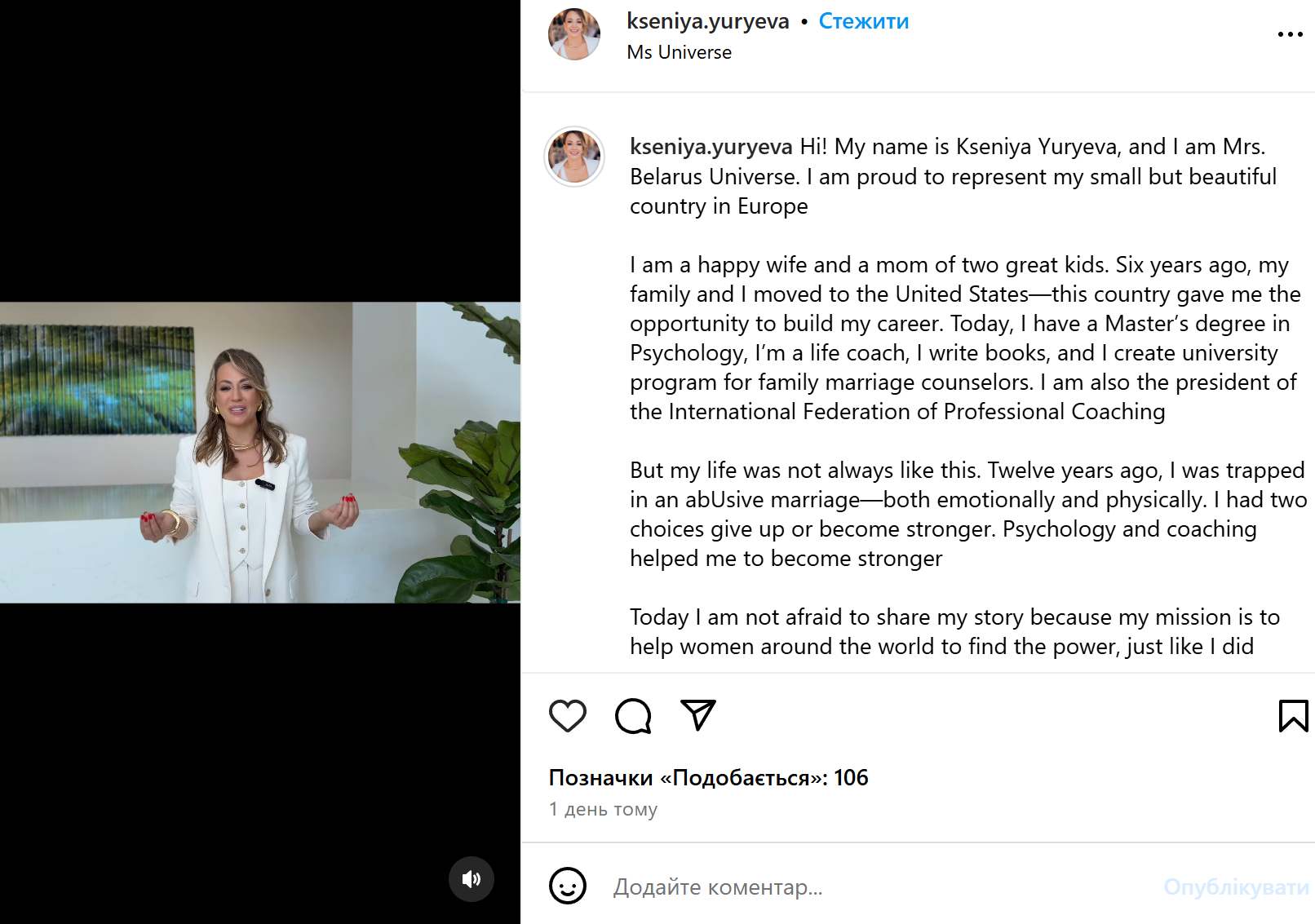 Я стала переможницею Miss USA Universe 2025. Історичний момент. Українка представляла США й перемогла. Але на сцені я – Україна. Я – посол правди про війну та геноцид в Україні. Я допомагаю нашій країні тут, у США, збираю кошти, підтримую армію, дітей, жінок і сім'ї, які постраждали від війни. Моя місія – це любов і правда,