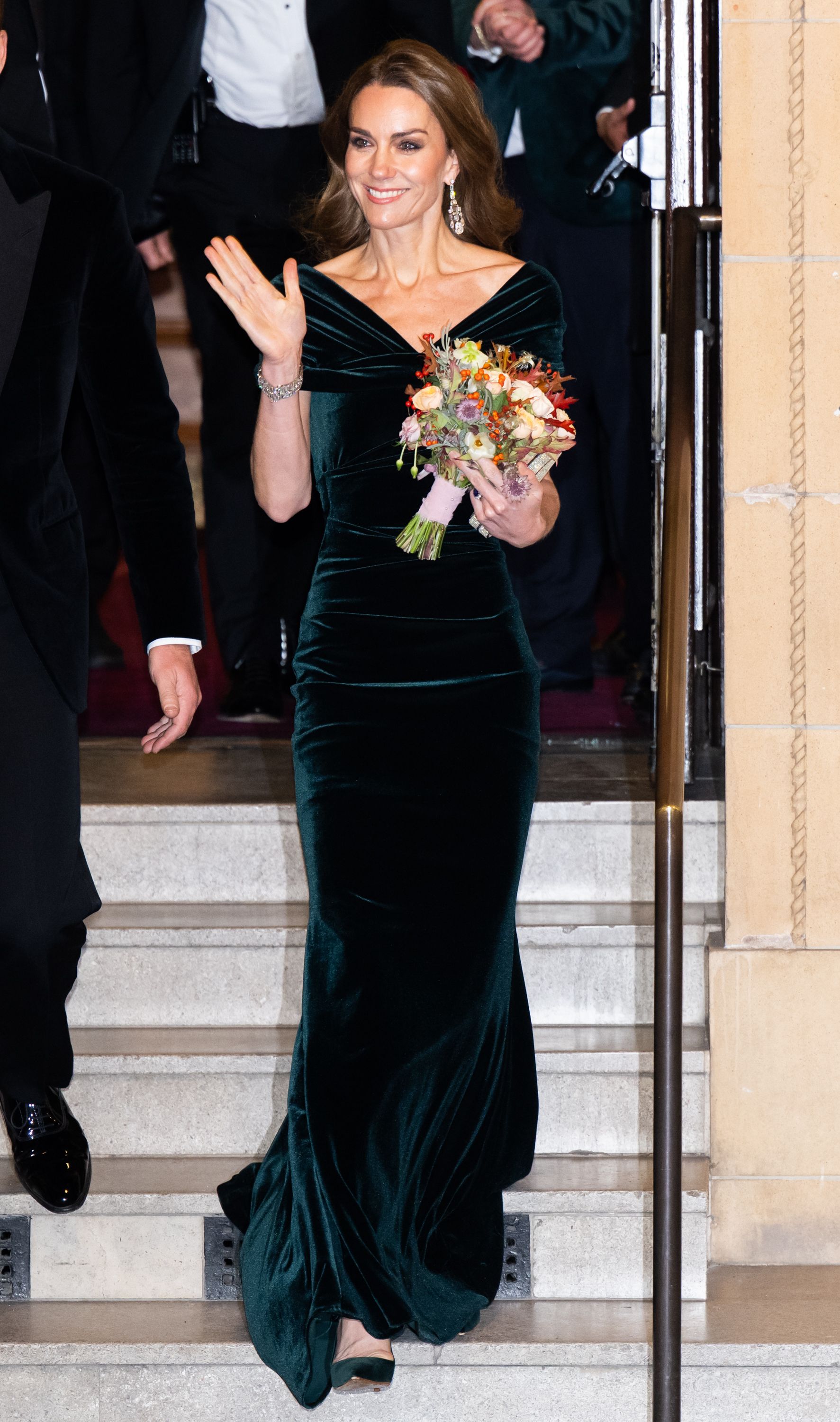 Очевидно, що публіка чекала на вихід Кейт Міддлтон, адже дружина Вільяма завжди приклад витонченості та елегантності. Для Royal Variety Performance принцеса Уельська обрала велюрову сукню темно-смарагдового кольору. Образ доповнила розкішним широким браслетом на руці, довгими сережками та блискучим клатчем. А підбори були у тон сукні. Волосся ж залишила розпущеним, але зробила хвилястим. А легкий вечірній макіяж доповнив загальний стиль Кейт.