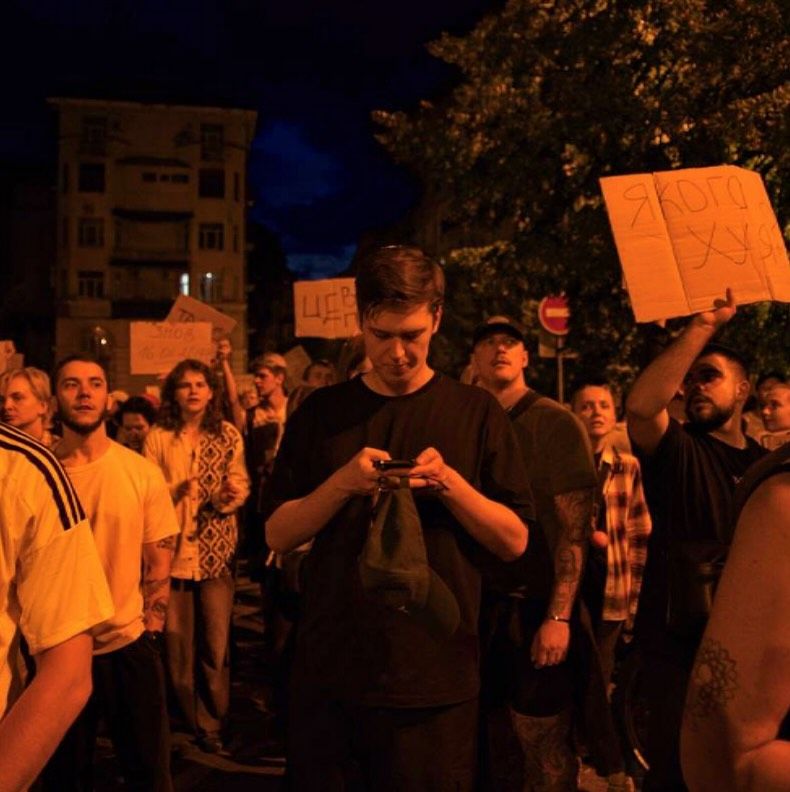 Гурт Ziferblat, який цьогоріч представляв Україну на Євробаченні, закликав людей виходити на протести у своїх містах. У Києві біля театру Франка помітили одного з учасників колективу – Валентина Лещинського.