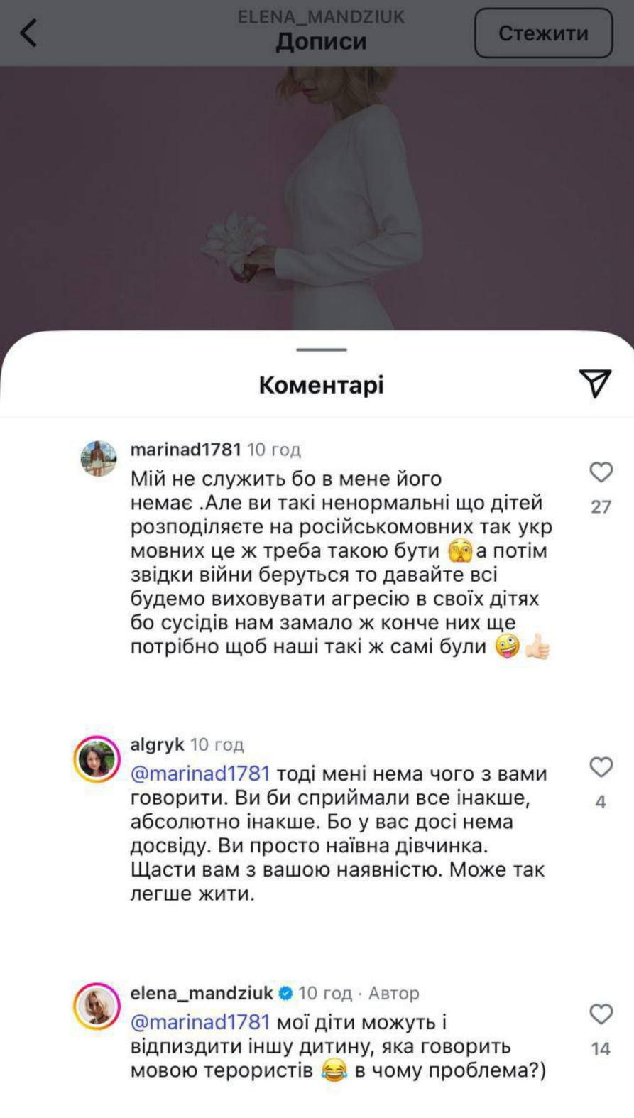 Так, близько місяця тому в коментарях під одним зі своїх дописів Олена написала, що її діти "можуть від*здити іншу дитину, яка говорить мовою терористів".