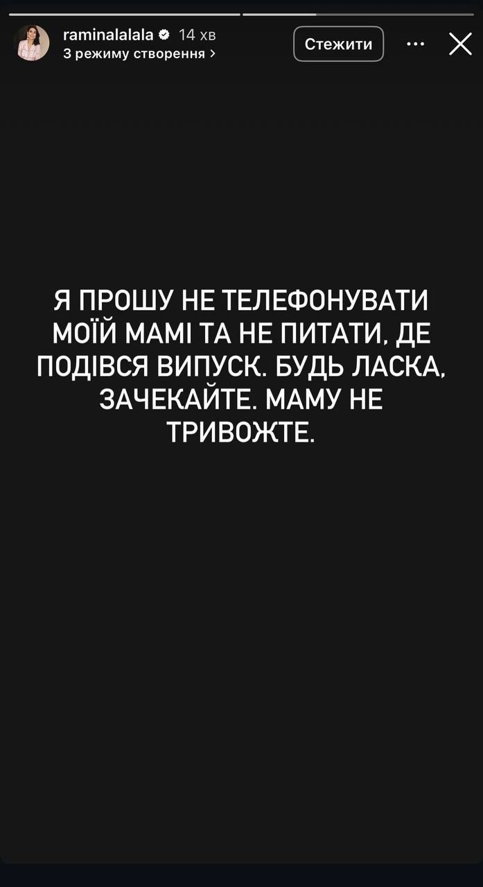Раміна також попросила людей не телефонувати її мамі й не запитувати про випуск.