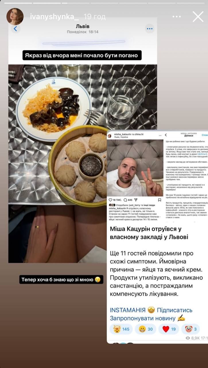 Настя Іванишин отруїлася в новому закладі Міші Кацуріна у Львові / Скриншоти з інстаграм-сторіс