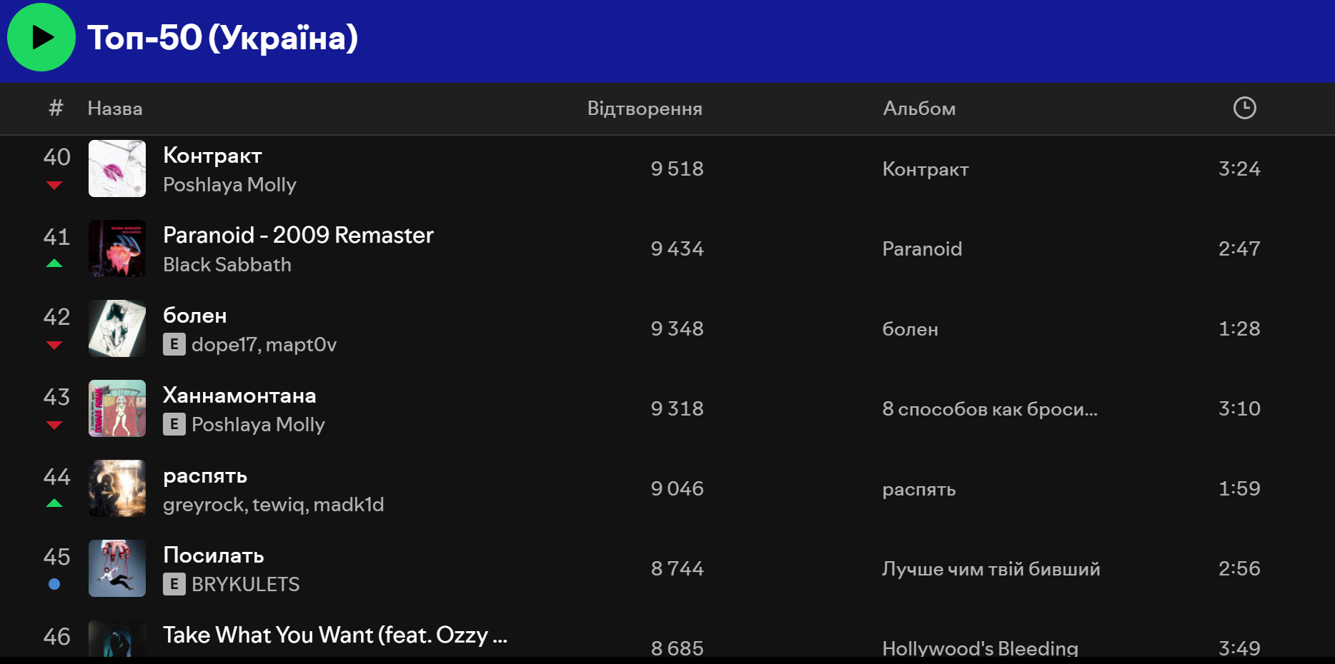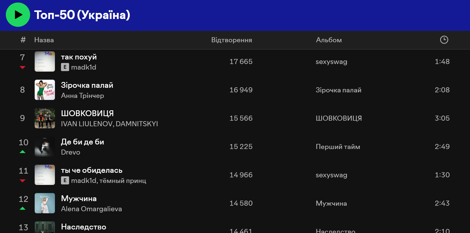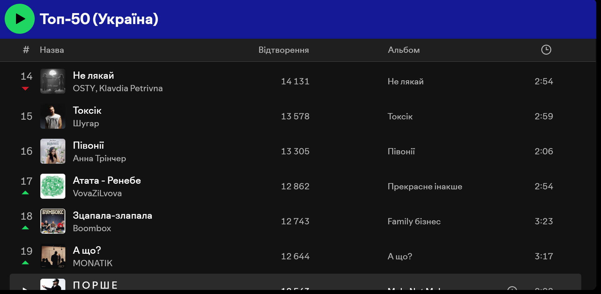 У Spotify ситуація схожа. У Топ 50 Україна перше місце, на момент написання матеріалу, займає пісня "Смак-печаль" – спільний трек Наді Дорофєєвої та Позитива, а на другому місці – "Смарагдове небо" Drevo. Водночас трійку лідерів закриває композиція "Олєг" виконавця Шугара.