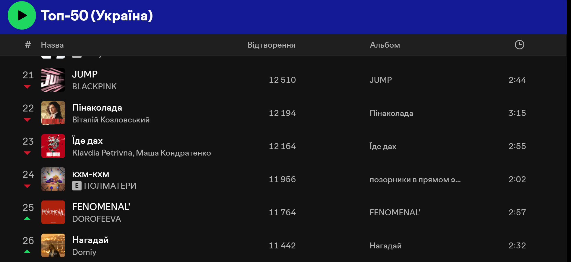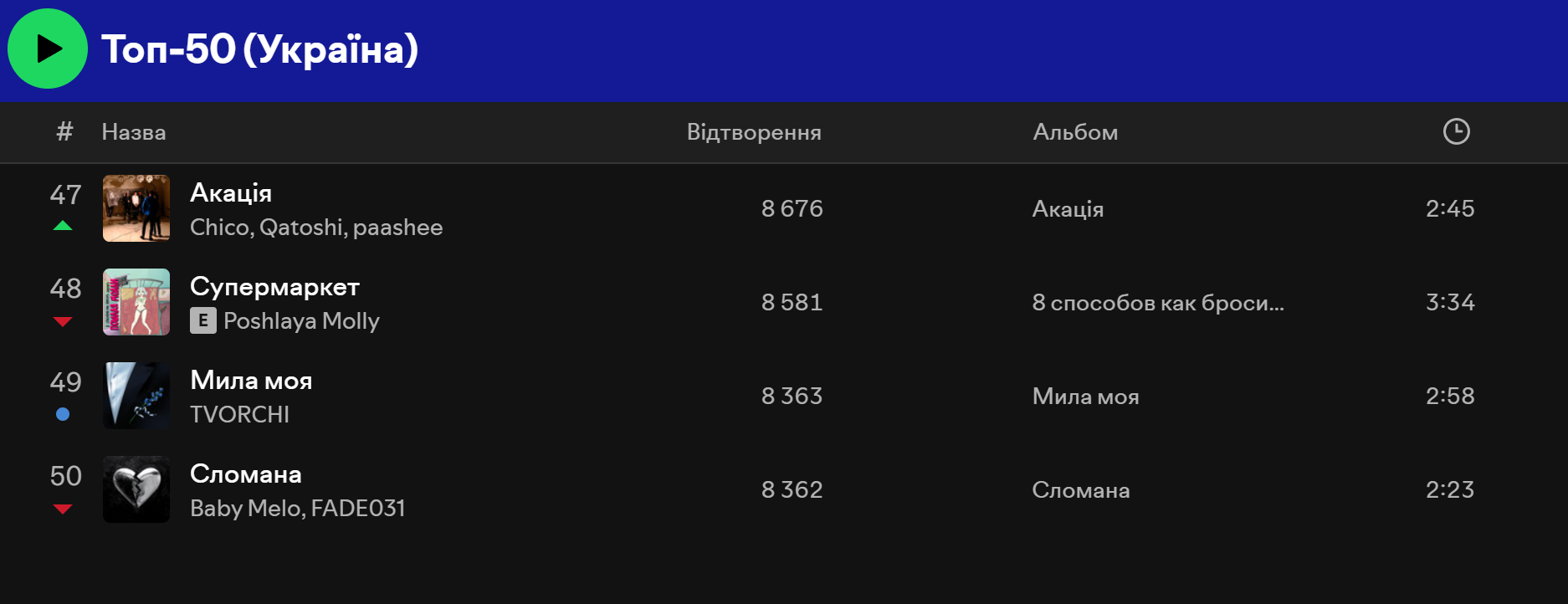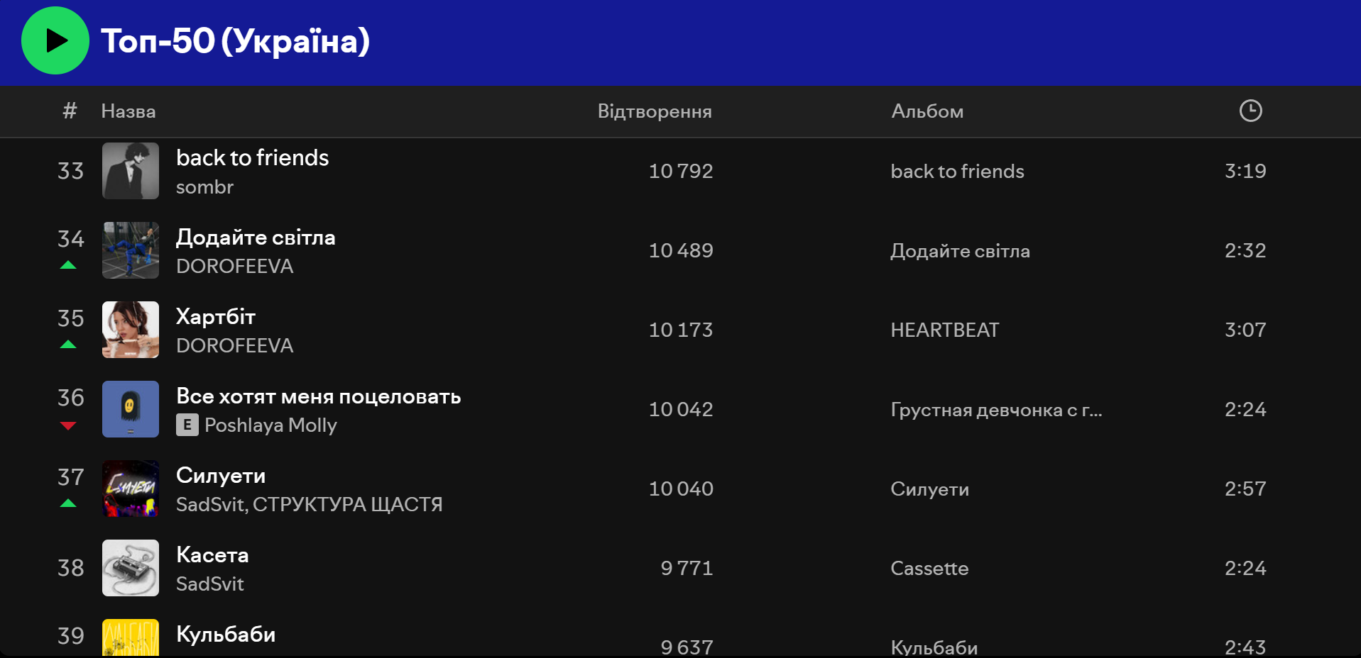 У Spotify ситуація схожа. У Топ 50 Україна перше місце, на момент написання матеріалу, займає пісня "Смак-печаль" – спільний трек Наді Дорофєєвої та Позитива, а на другому місці – "Смарагдове небо" Drevo. Водночас трійку лідерів закриває композиція "Олєг" виконавця Шугара.