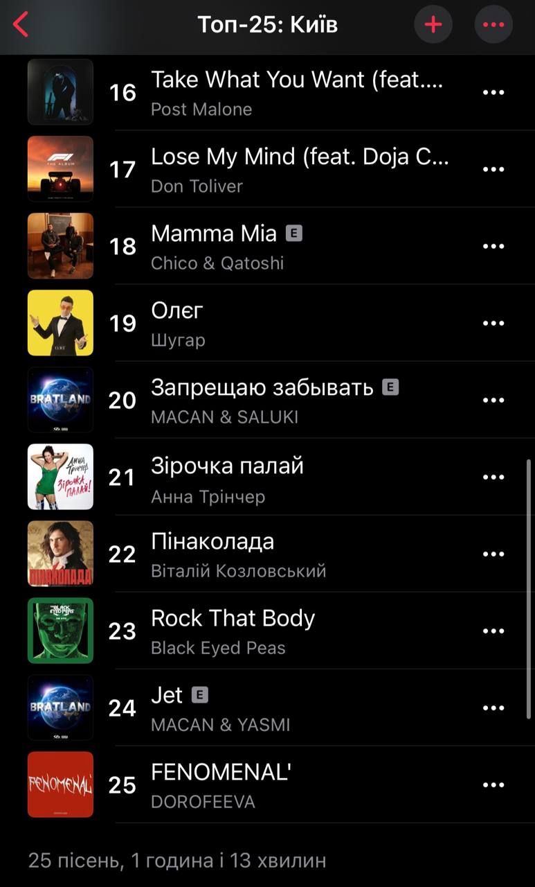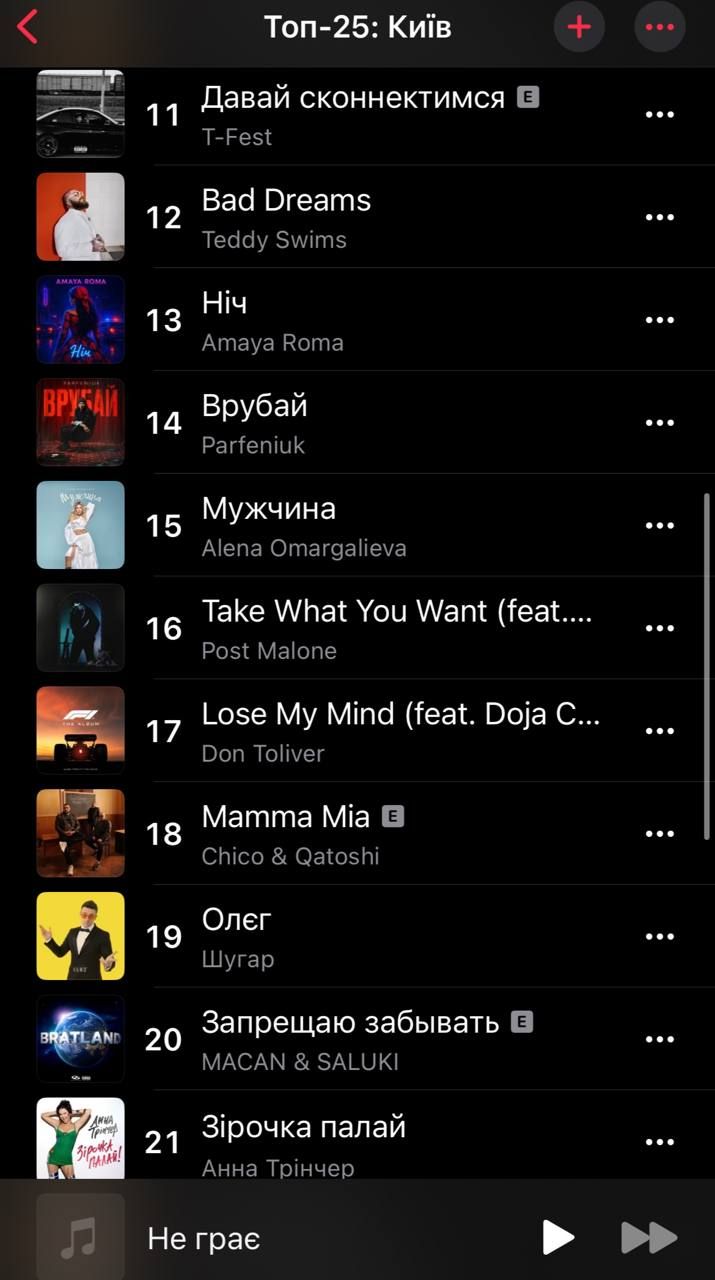 Які пісні слухають в Києві в Apple music / Скриншот з мобільного додатку