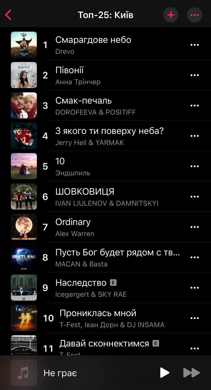 1 серпня в Києві був оголошений День жалоби за жертвами масованої атаки на Київ. Тоді загинула 31 людина, серед яких п'ятеро дітей. Але, попри війну, у Топ-25 Apple Music (Київ) все ще з'являються треки російських виконавців. Серед них – Ендшпіль, MACAN, Basta, ICEGERGERT, SKY RAE.