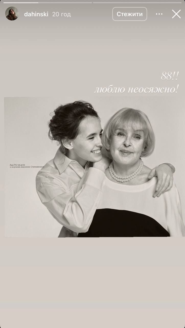- 16 июля Ада Роговцева отпраздновала 88-й день рождения, получив поздравления от семьи, включая жену внука Викторию Степанкову и внучку Дарью.