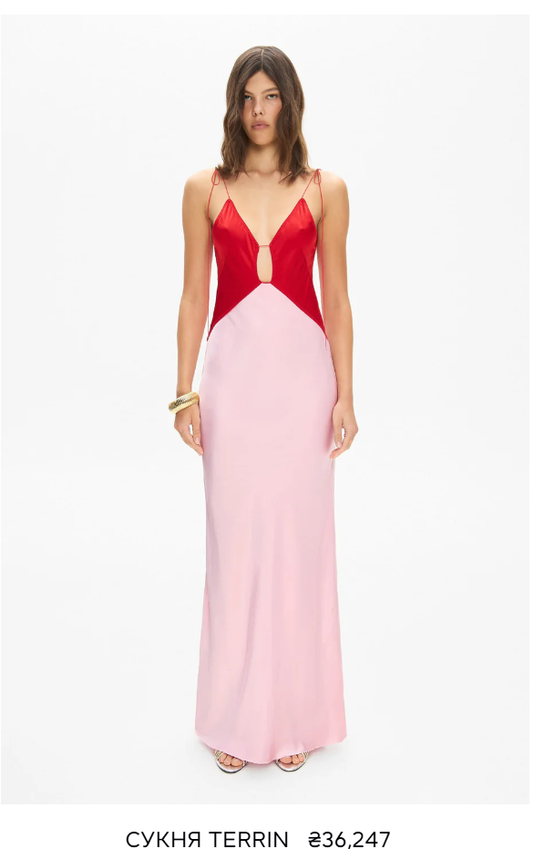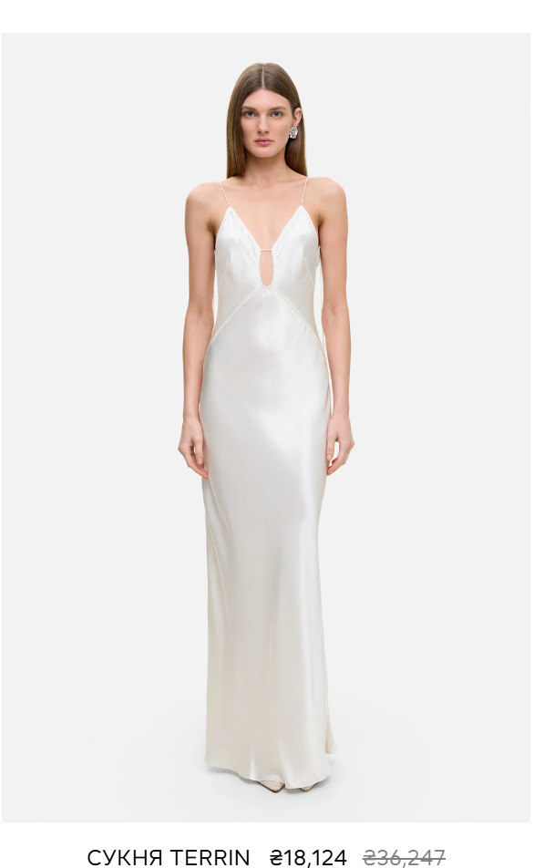 Их платье Terrin – это современная интерпретация королевской элегантности. Модель имеет длинную юбку, универсальный косой крой, регулируемые бретели на завязках и глубокий вырез, подчеркивающий зону декольте. На сайте указано, что при создании дизайнер вдохновлялась образом Одри Хепберн в "Завтраке у Тиффани", но переосмыслила его по-современному.