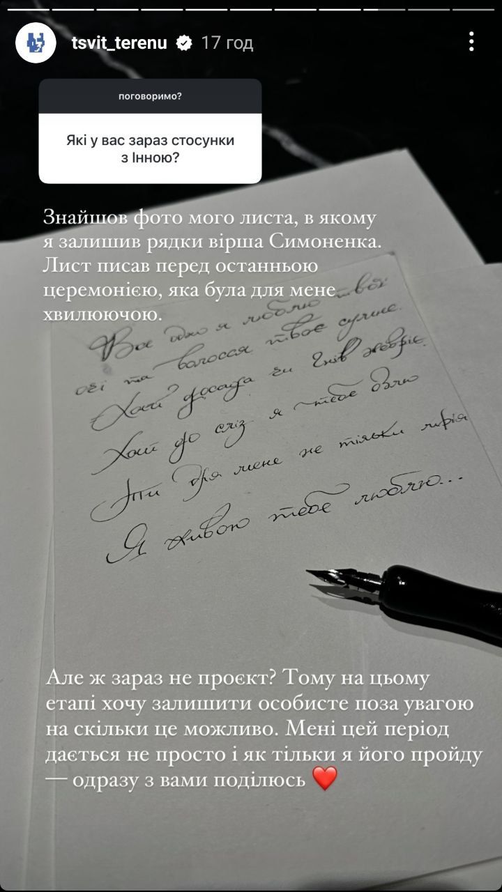 Отвечая на вопрос об отношениях с Инной Белень, Александр Терен опубликовал письмо, которое он написал перед последней церемонией роз на "Холостяке". Это строки из стихотворения Василия Симоненко. Кроме того, военнослужащий намекнул на расставание с волонтеркой, оставив довольно неоднозначный ответ.