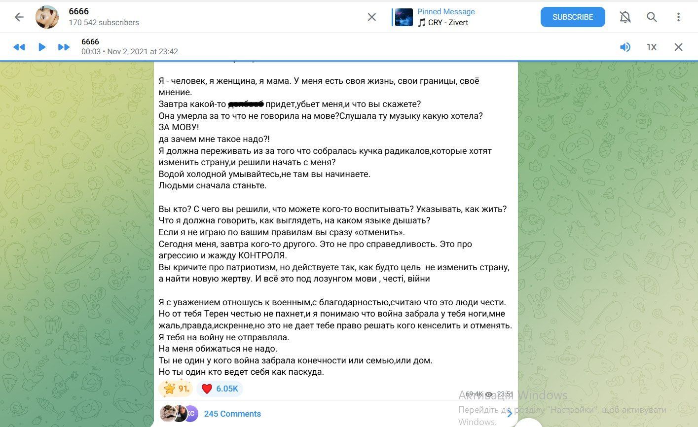 По словам блогерши, "языковой конфликт" длится уже месяц, в то время, как в стране "множество проблем". Алхим добавила, что "по всей Украине люди разговаривают на русском языке и слушают русскую музыку" и возмутилась тем, что кто-то решил, что имеет право их "наказывать".