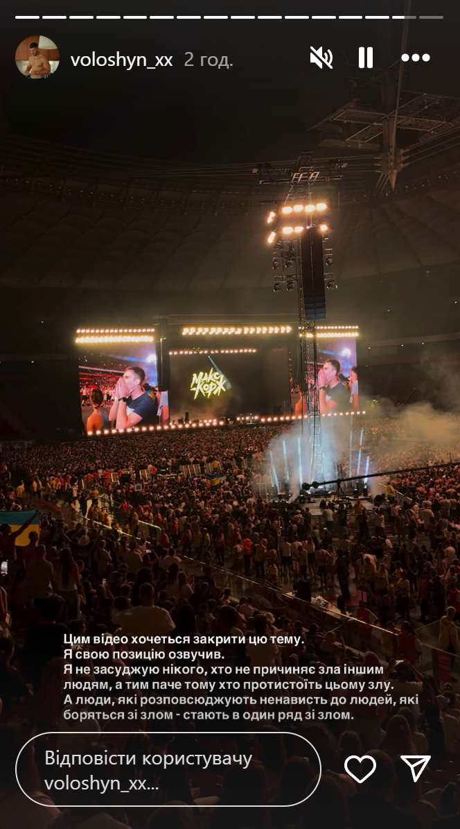 Александр Волошин посетил концерт Макса Коржа и прокомментировал это / Скриншот из инстаграм-сторис