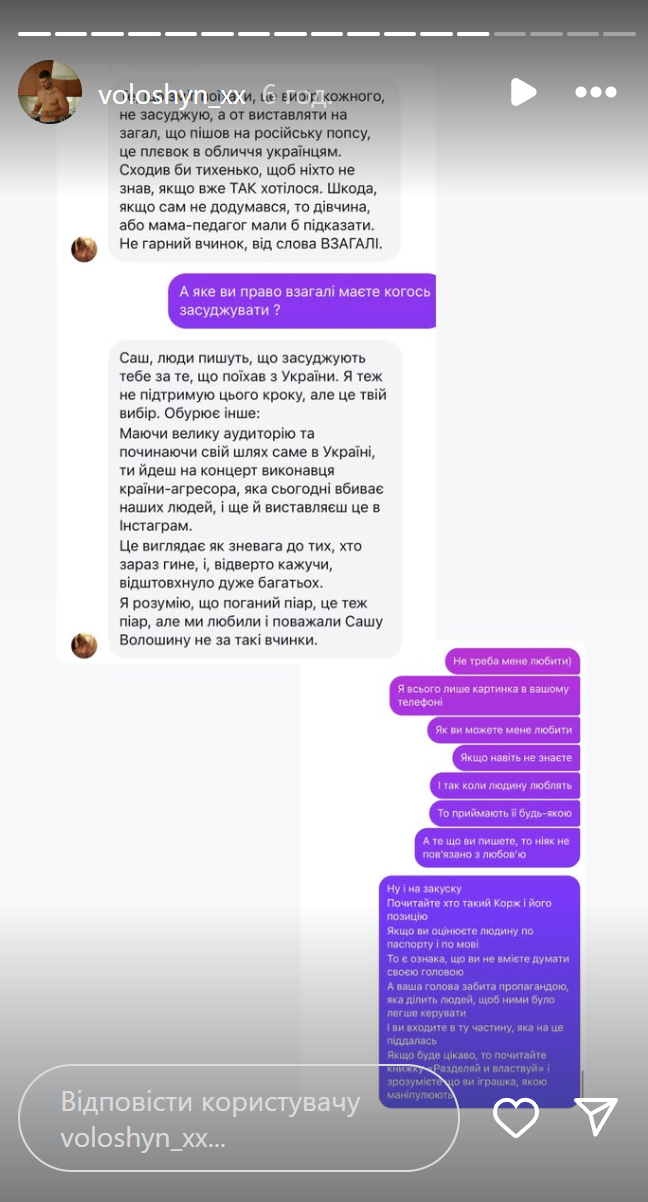 Так, Волошина критикуют из-за того, что он посетил концерт певца, который поет на русском и имеет много фанов в России – стране, которая воюет против Украины.