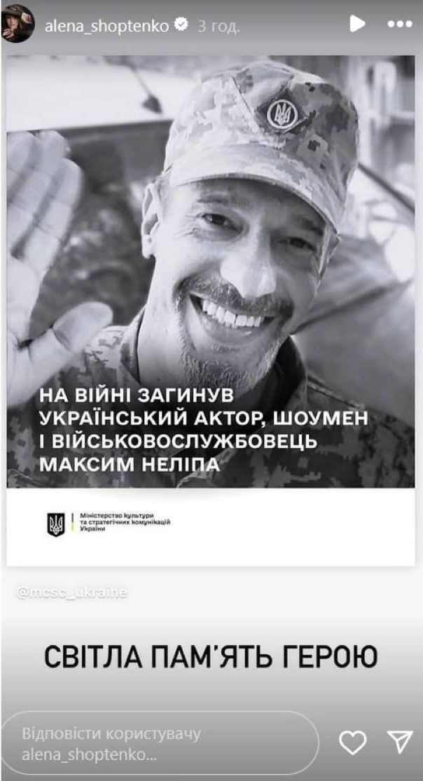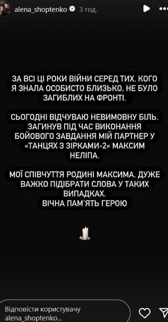 За все эти годы войны среди тех, кого я знала лично, не было погибших на фронте. Сегодня чувствую неописуемую боль. Погиб во время боевого задания мой партнер в "Танцах со звездами-2" Максим Нелипа. Мои соболезнования семье Максима. Очень трудно подобрать слова в таких случаях. Вечная память герою,