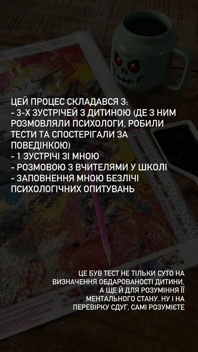 Процесс этой проверки состоял из нескольких встреч специалистов с ребенком: с ним общались психологи, наблюдали за его поведением. Также проводились встречи со звездной мамой и учителями. Тест должен был проверить не только одаренность мальчика, но и его ментальное состояние.