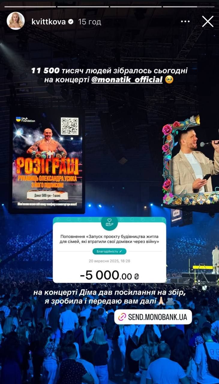- 20 сентября в Киеве во Дворце спорта состоялся концерт Дмитрия Монатика, на котором выступили известные украинские артисты, такие как DOROFEEVA, Dantes и Alina Pash.