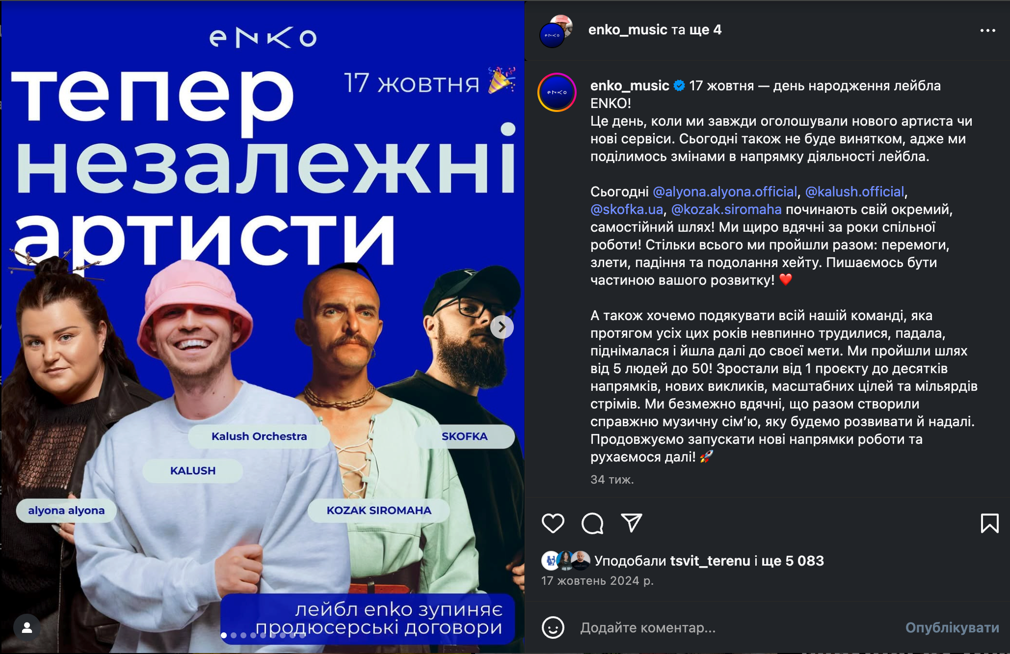 В 2020 году alyona alyona в сотрудничестве с Иваном Клименко запустила музыкальный лейбл ENKO. Но в октябре прошлого года стало известно о том, что рэперша начала самостоятельный путь.