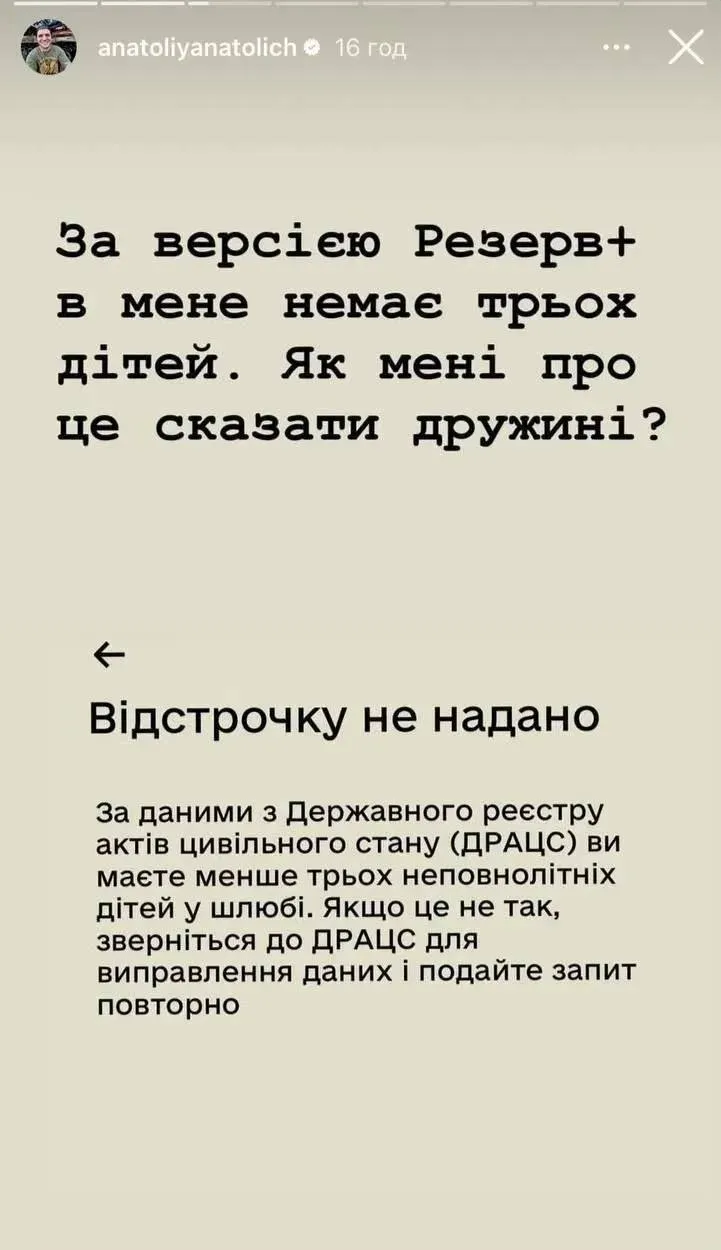 Анатолий Анатолич показал скриншот из приложения для военнообязанных. Там указано, что по данным из ДРАЦСа, у шоумена меньше чем трое несовершеннолетних детей. Именно поэтому ведущий не смог получить отсрочку.