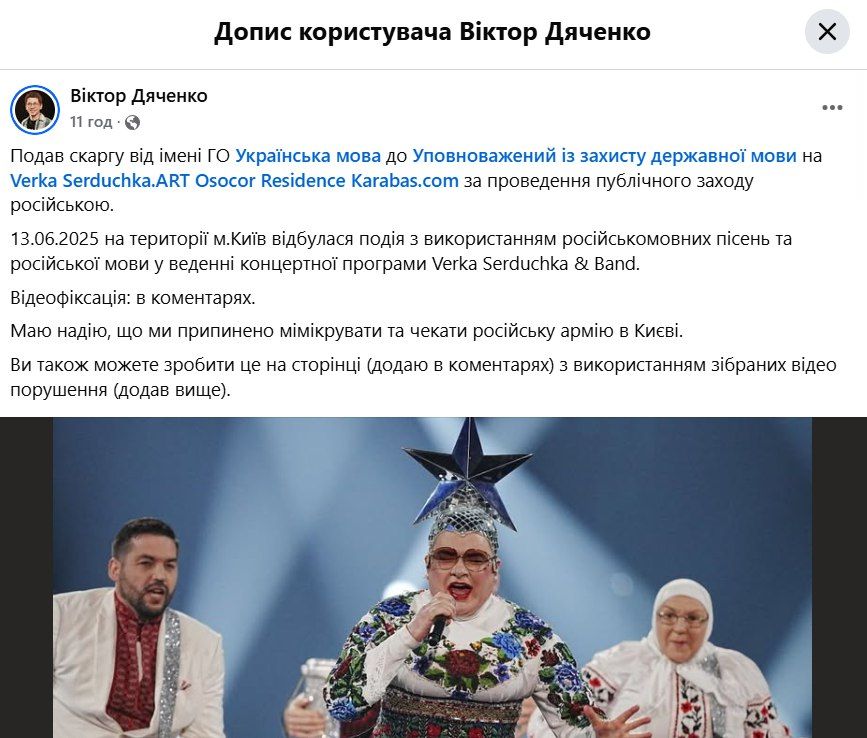Телеведущий и журналист Виктор Дяченко сообщил, что подал жалобу к Уполномоченному по защите государственного языка Тарасу Кременю от имени общественной организации "Украинский язык" на Верку Сердючку, Osocor Residence, где проходил концерт, и на оператора по продаже билетов Karabas.com.
