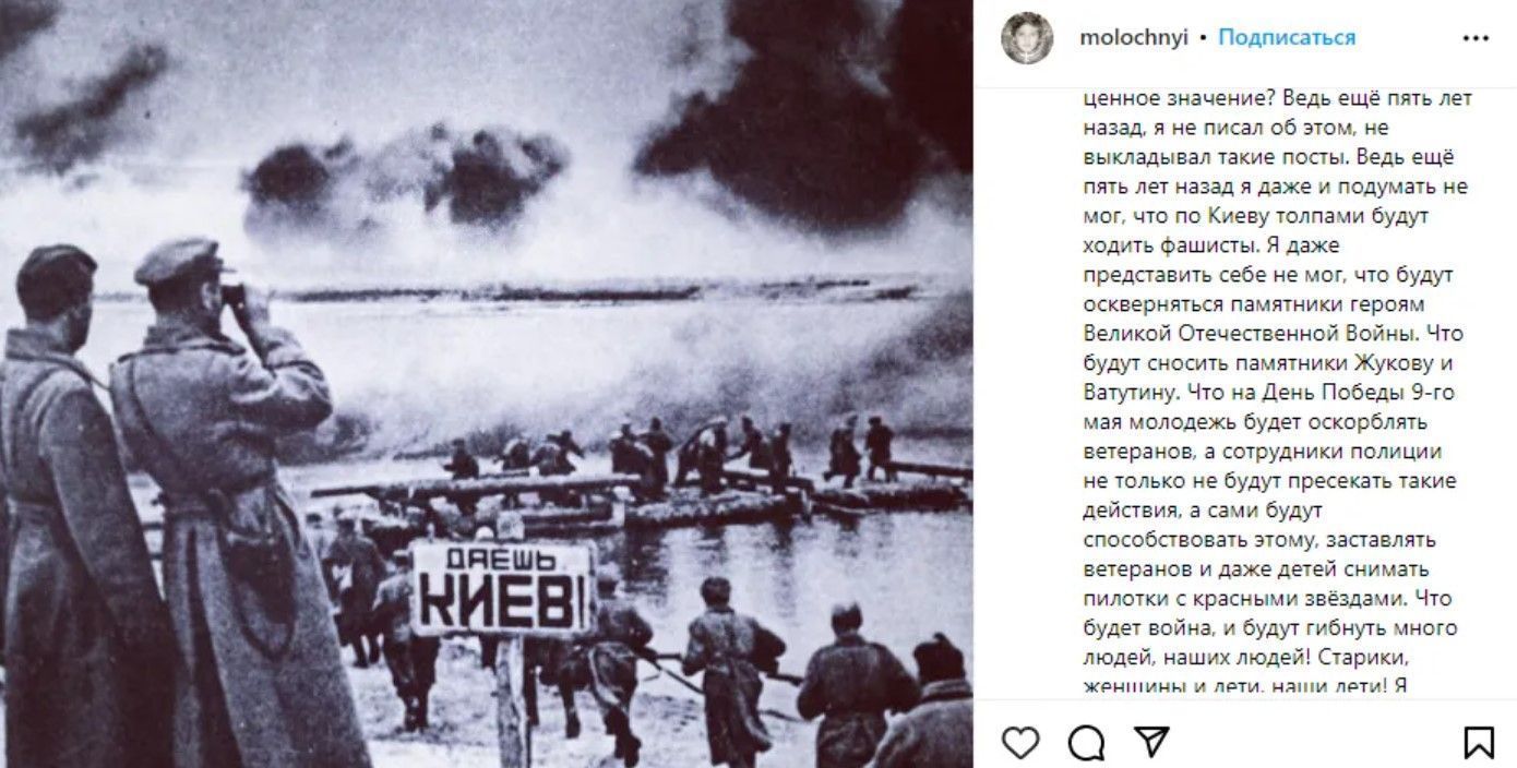 Когда в Украине началась Революция Достоинства, то юморист, как и присуще предателям, переехал в Россию жить свои "лучшие годы". И в 2019 году уже появился очередной звоночек, который указывал, что российская пропаганда негативно влияет на Молочного. Комик опубликовал сообщение в соцсетях, где написал, что "Киевом ходят фашисты".